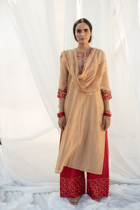 ColorBEIGE-RED FabricCHANDERI KURTA, PALLAZZOS, DUPATTA SET Pieces in the setK+P+D (3 PCS) Embroidery details HAND...
