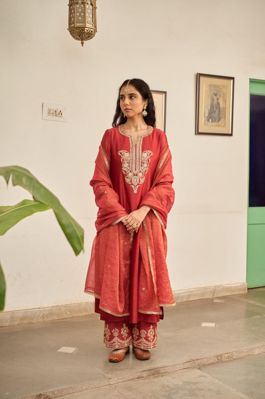 Colour - RED Fabric - CHANDERI, TISSUE,BAMBOO COTTON Pieces in the set - KURTA-PANT-DUPATTA (3 PCS)...