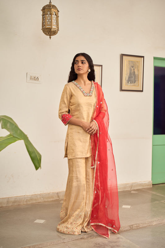 Colour - GOLD - RED Fabric - TISSUE,ORGANZA Pieces in the set - KURTA-PENT-DUPATTA (3...