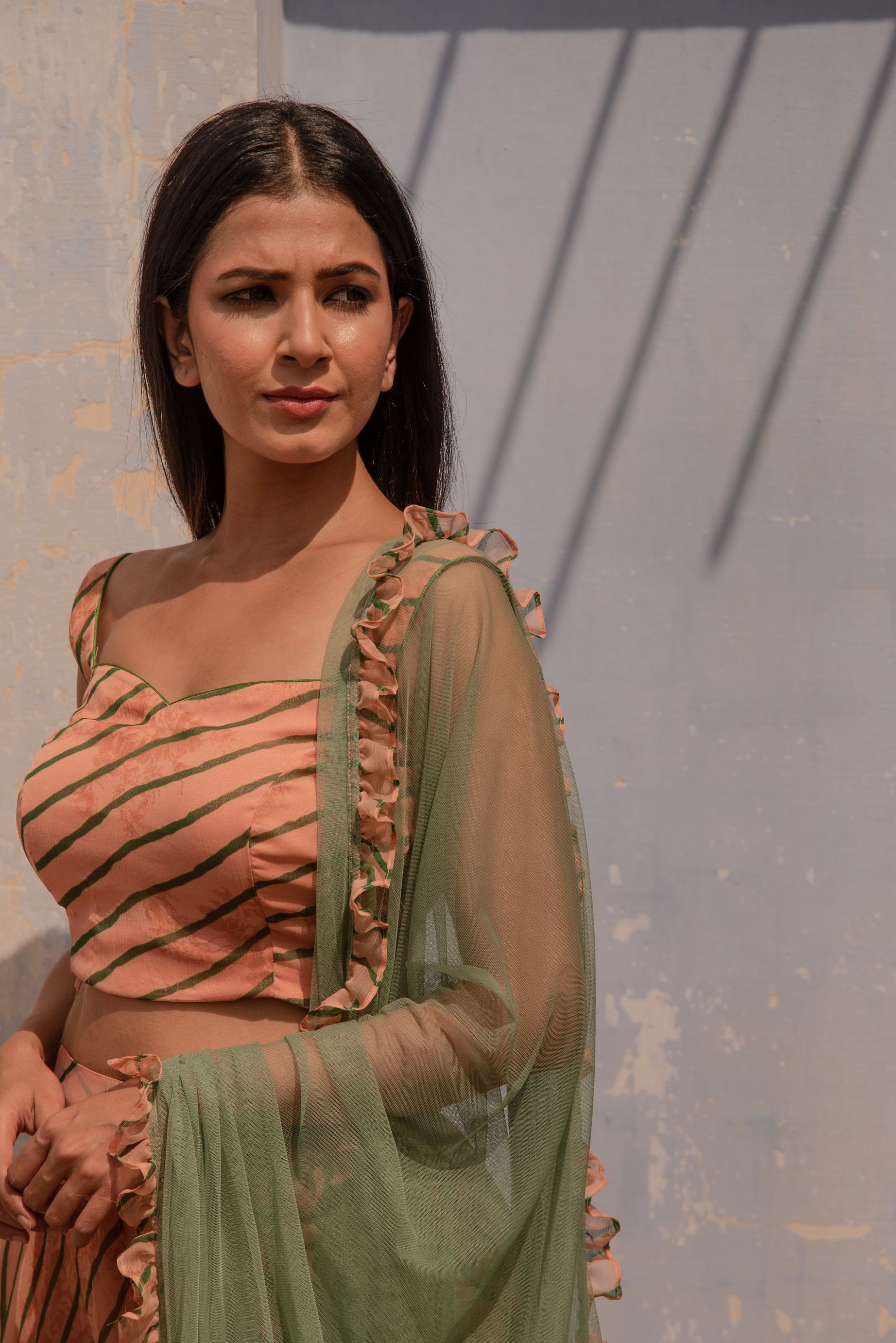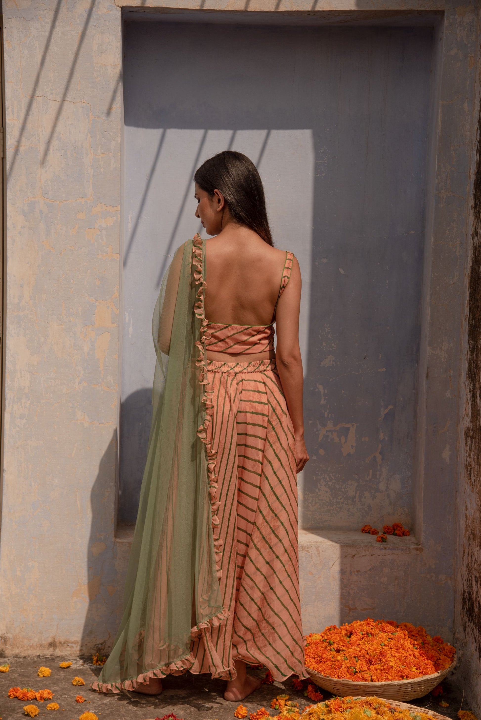 Fusion set with a blouse palazzos in leheriya comes with a ruffled net dupatta