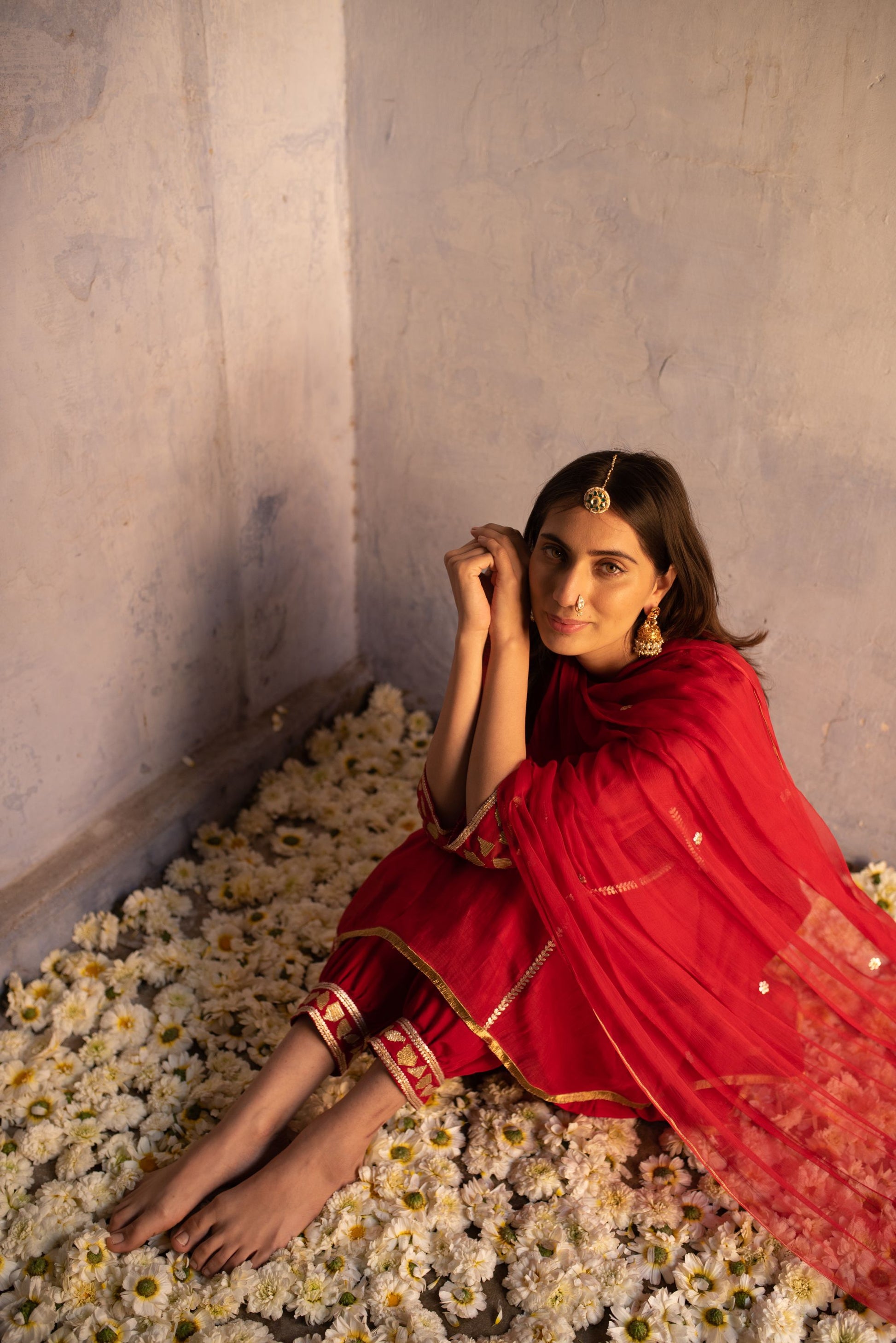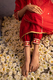 Chanderi kurta set in red detailed with gotta and kasab embroidery on kurta and salwar pants comes with a chiffon dupatta