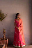 Bright pink lehenga in silk with gotta flowers detailing done on the lehenga paired with a blouse and a dupatta detailed with sequins