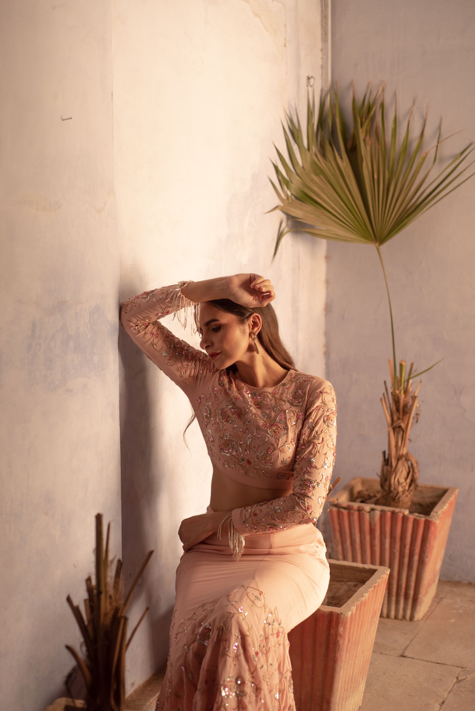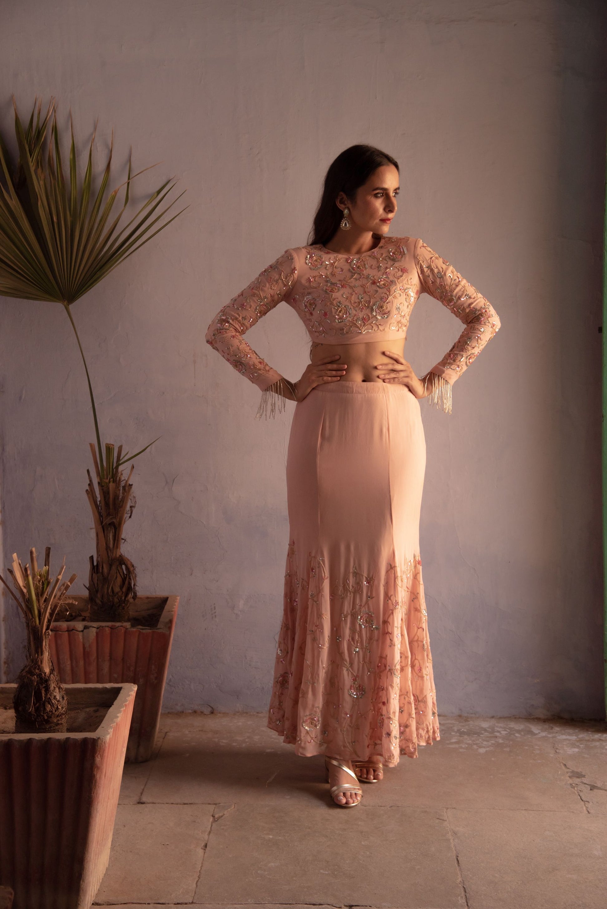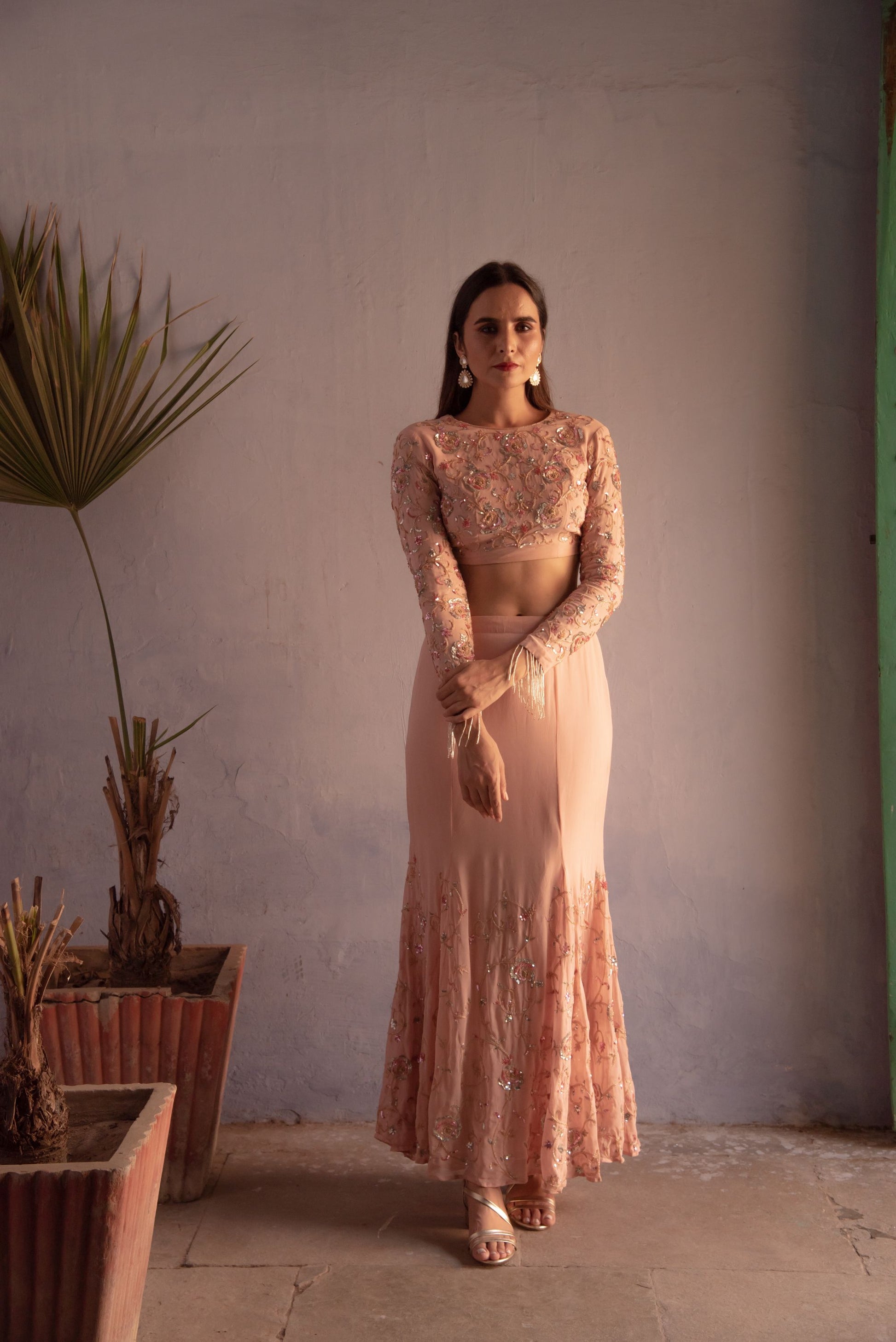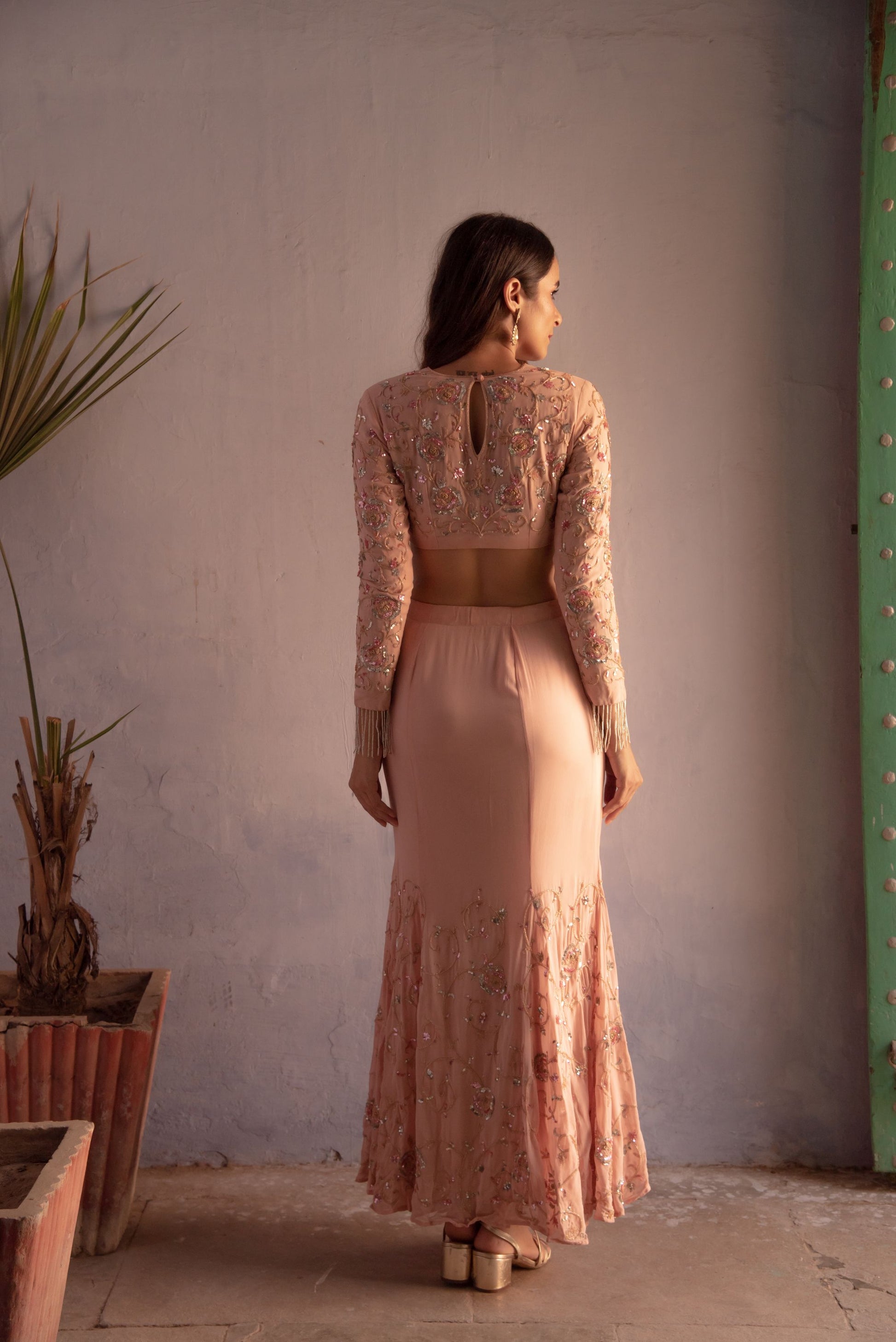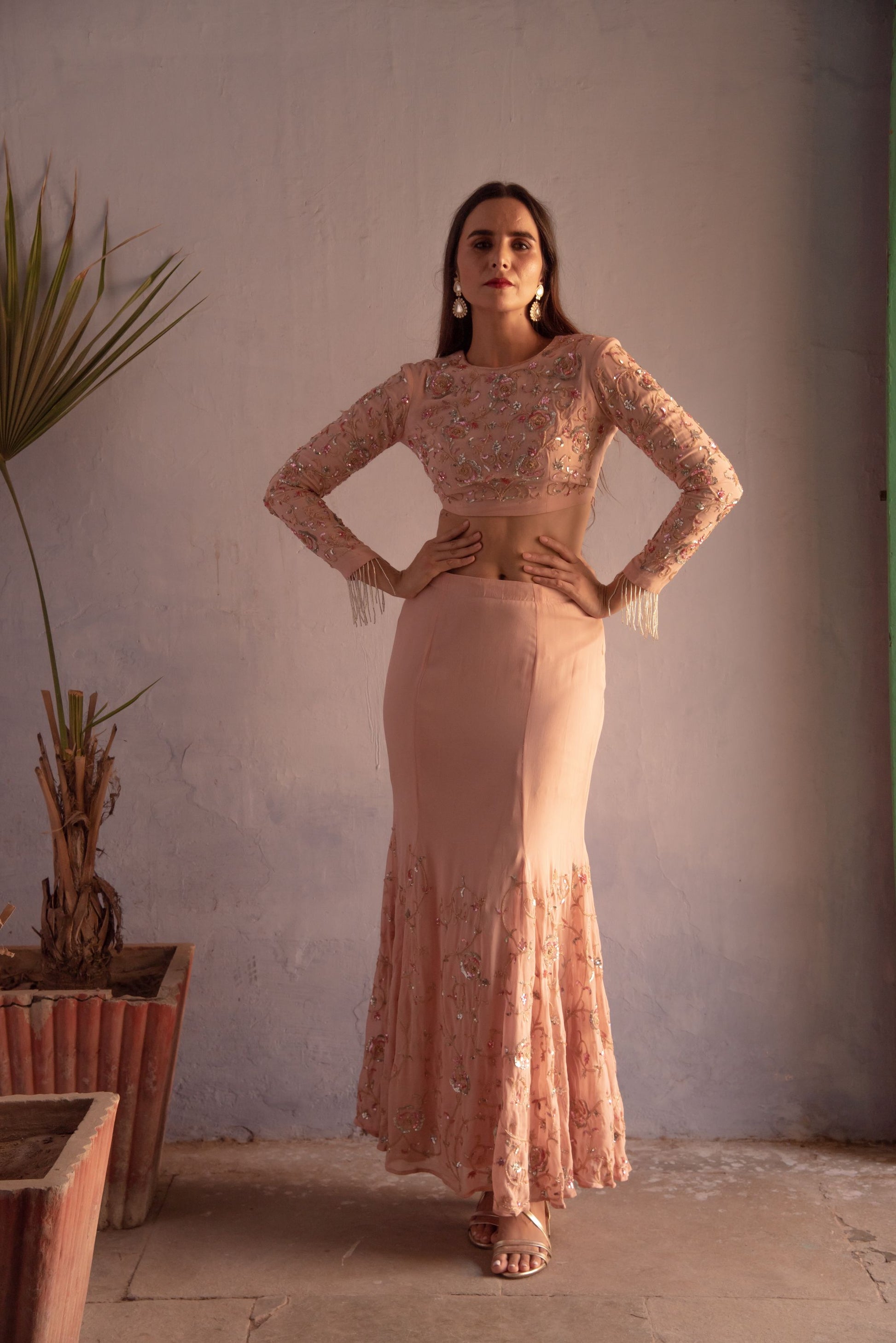 Fish cut style skirt and top embedded with coloured sequins roses all over