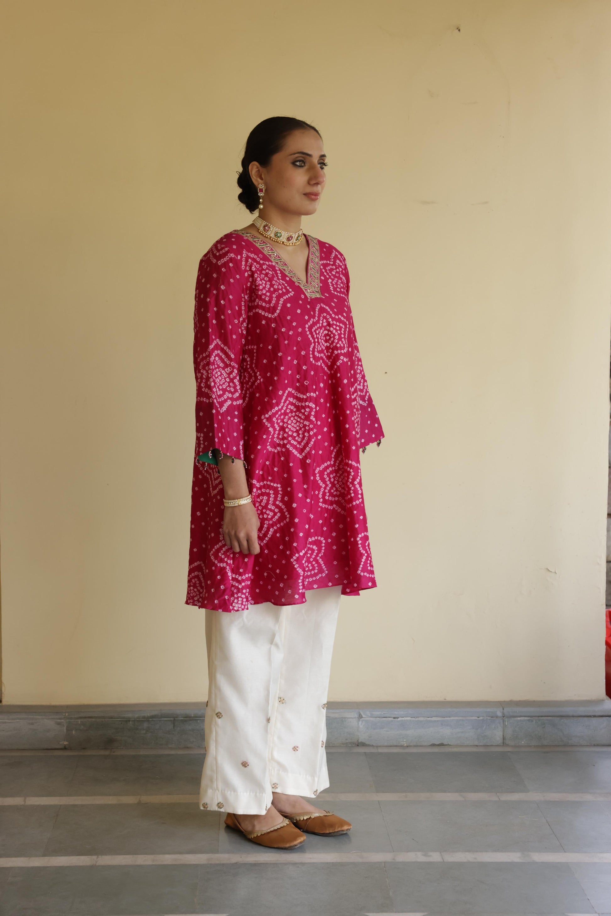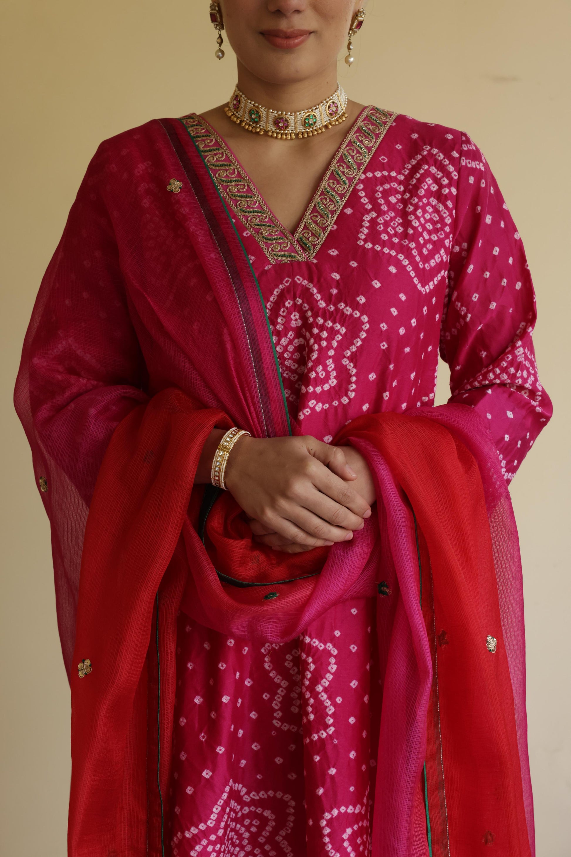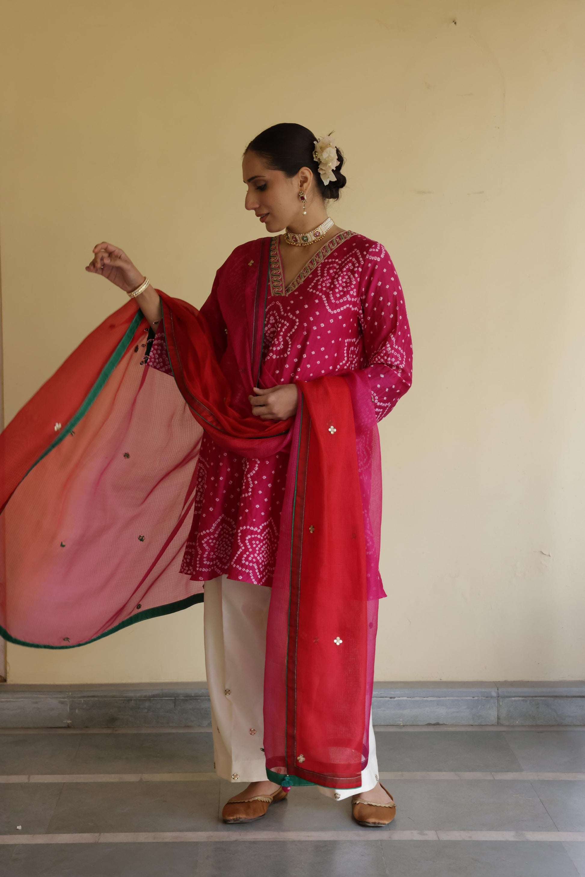 Description - Chanderi bandhej A-Line short kurta set hand embroidered with marori work on neckline comes with chanderi pants with booties paired with kota silk dupatta.