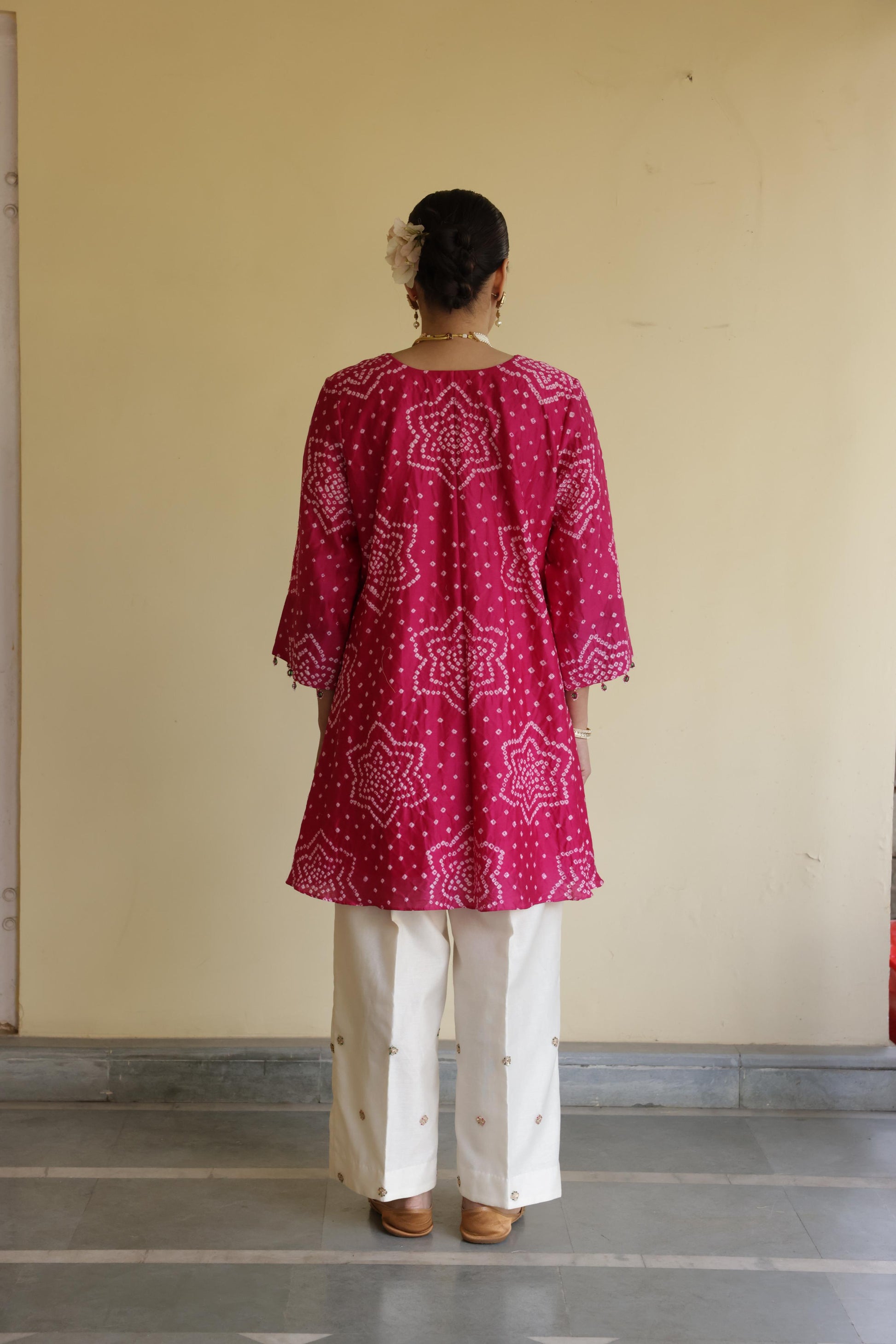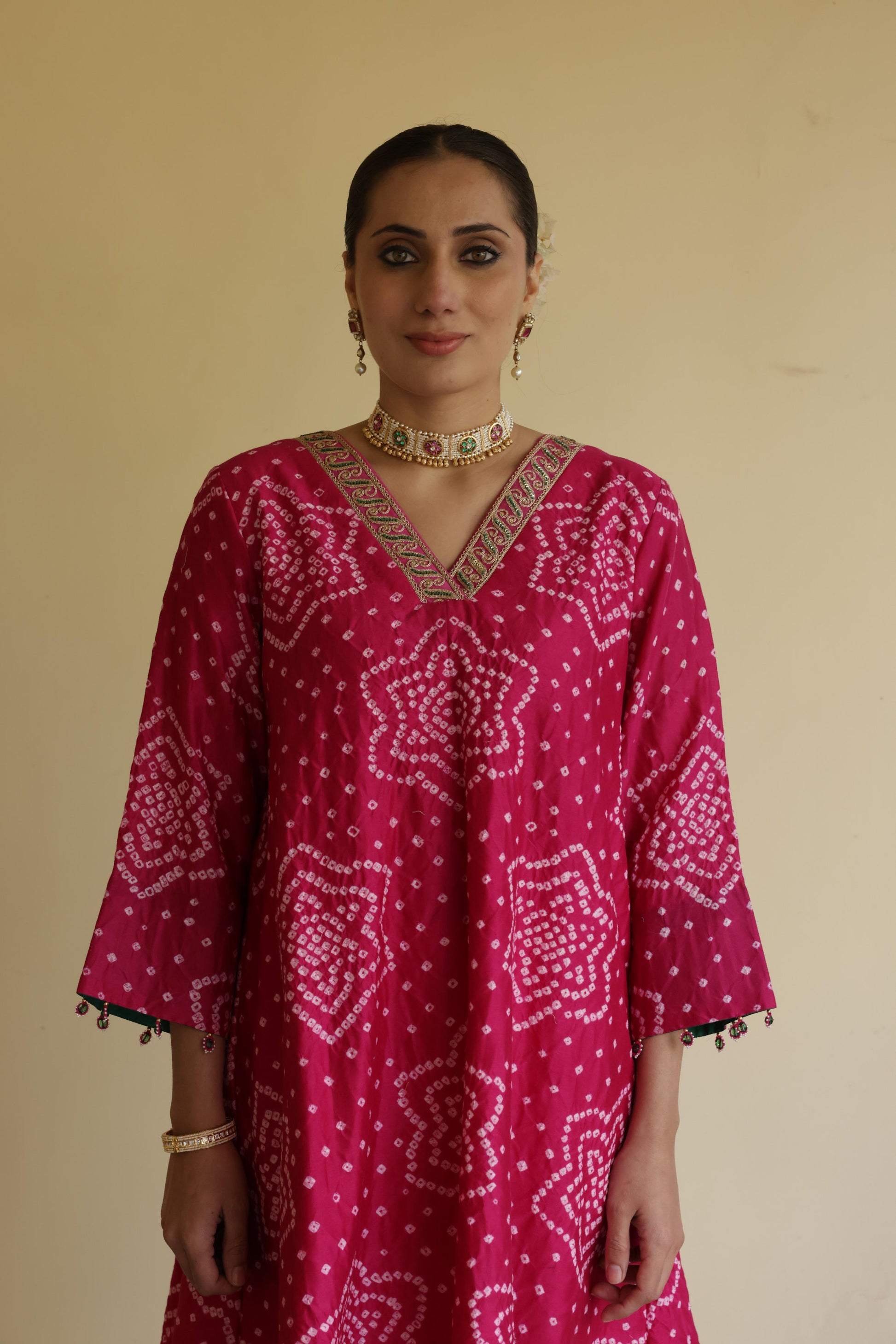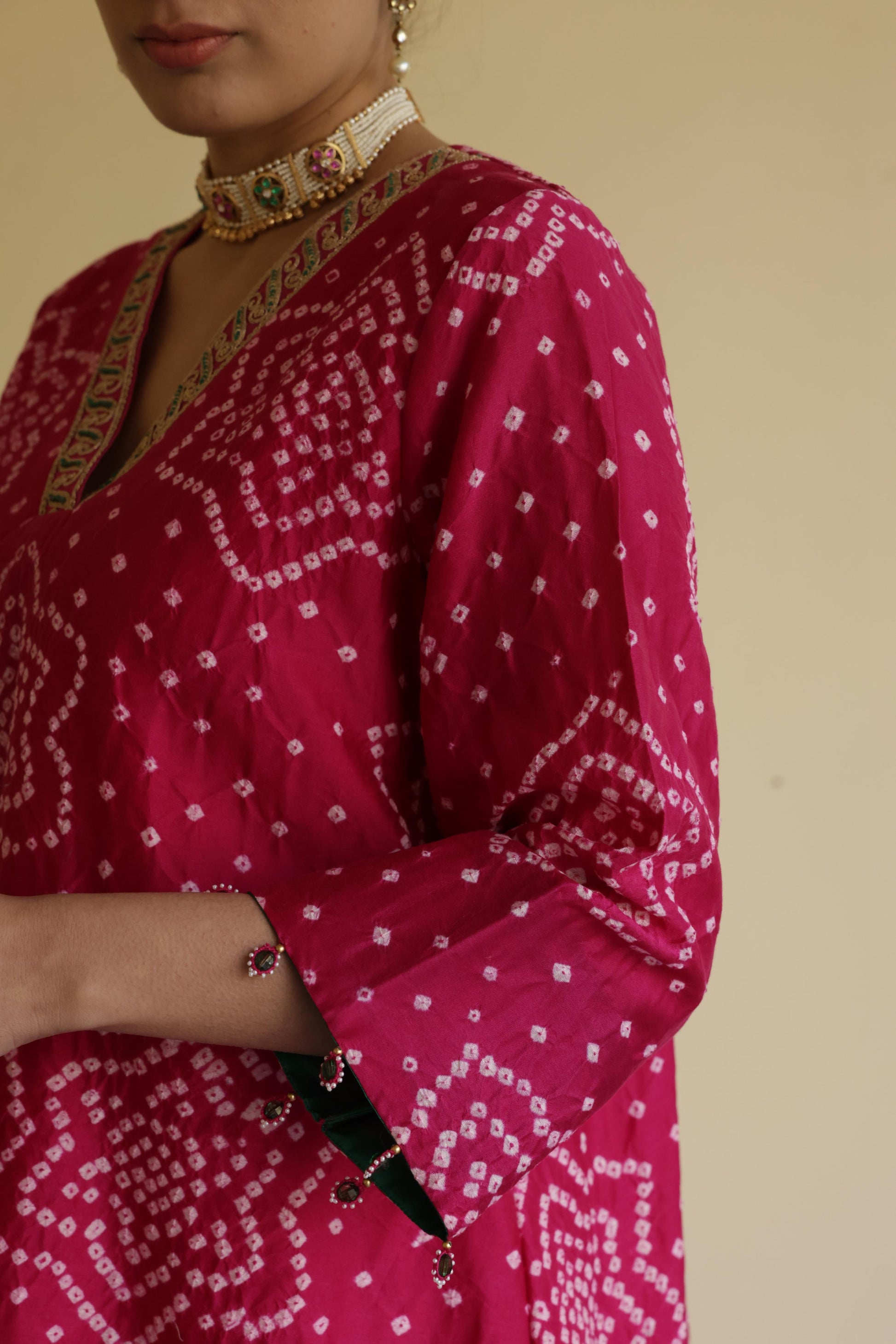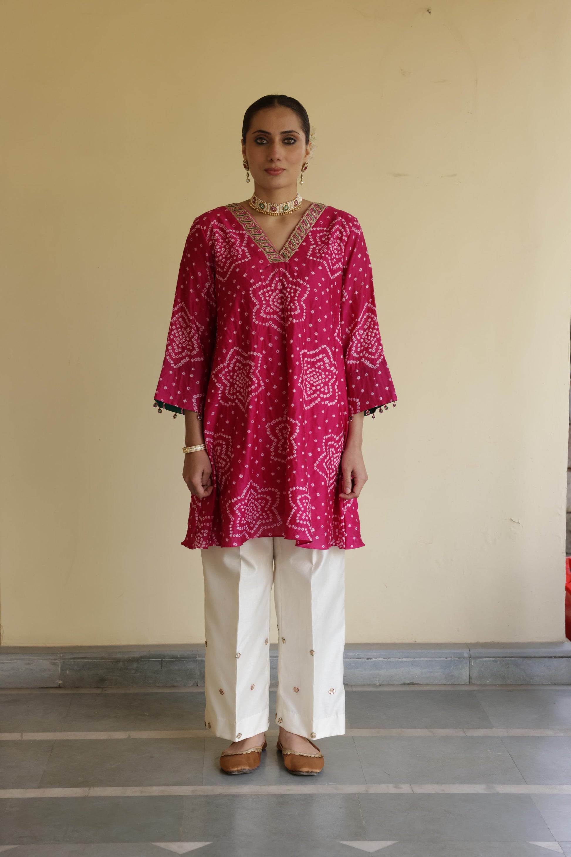 Description - Chanderi bandhej A-Line short kurta set hand embroidered with marori work on neckline comes with chanderi pants with booties paired with kota silk dupatta.