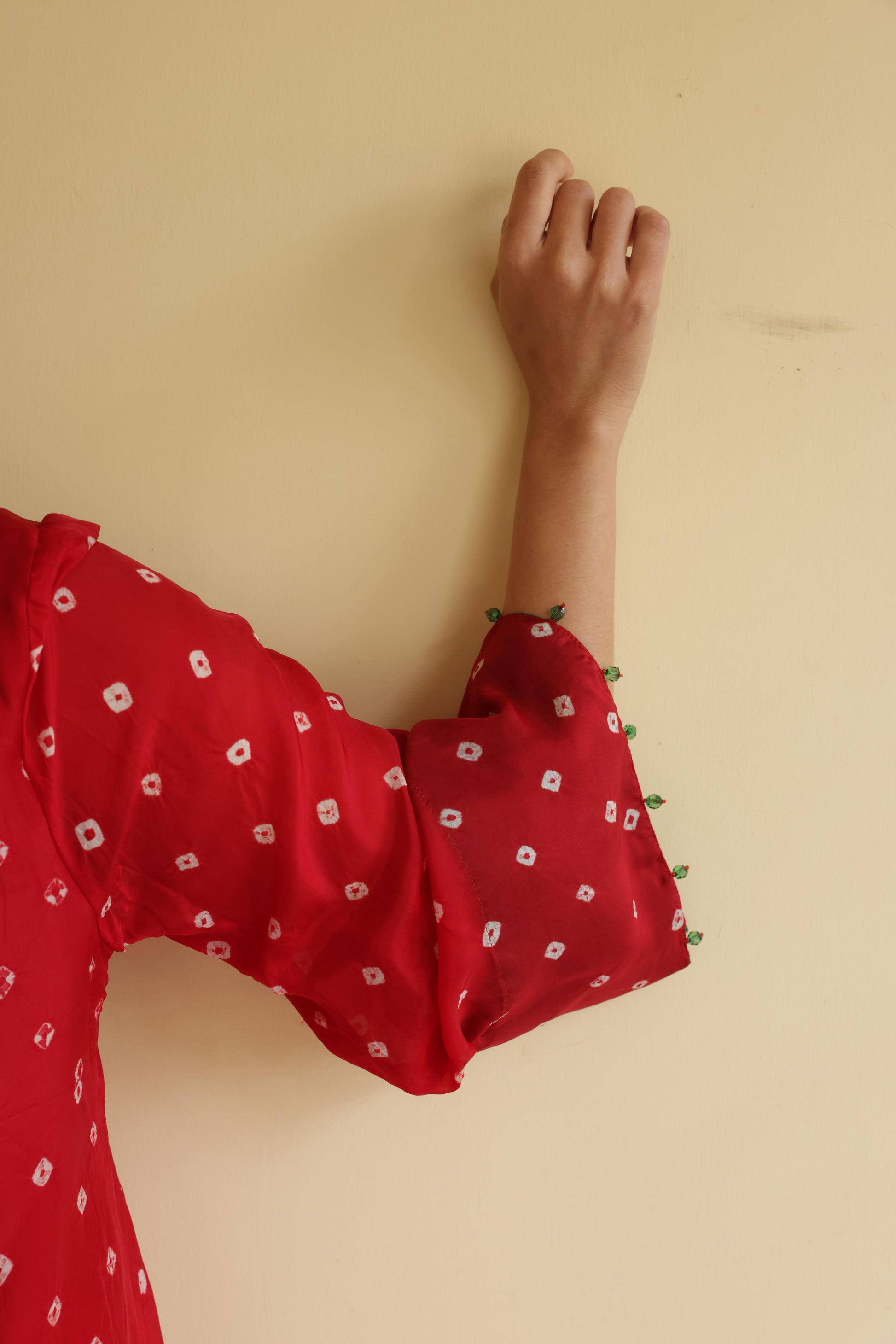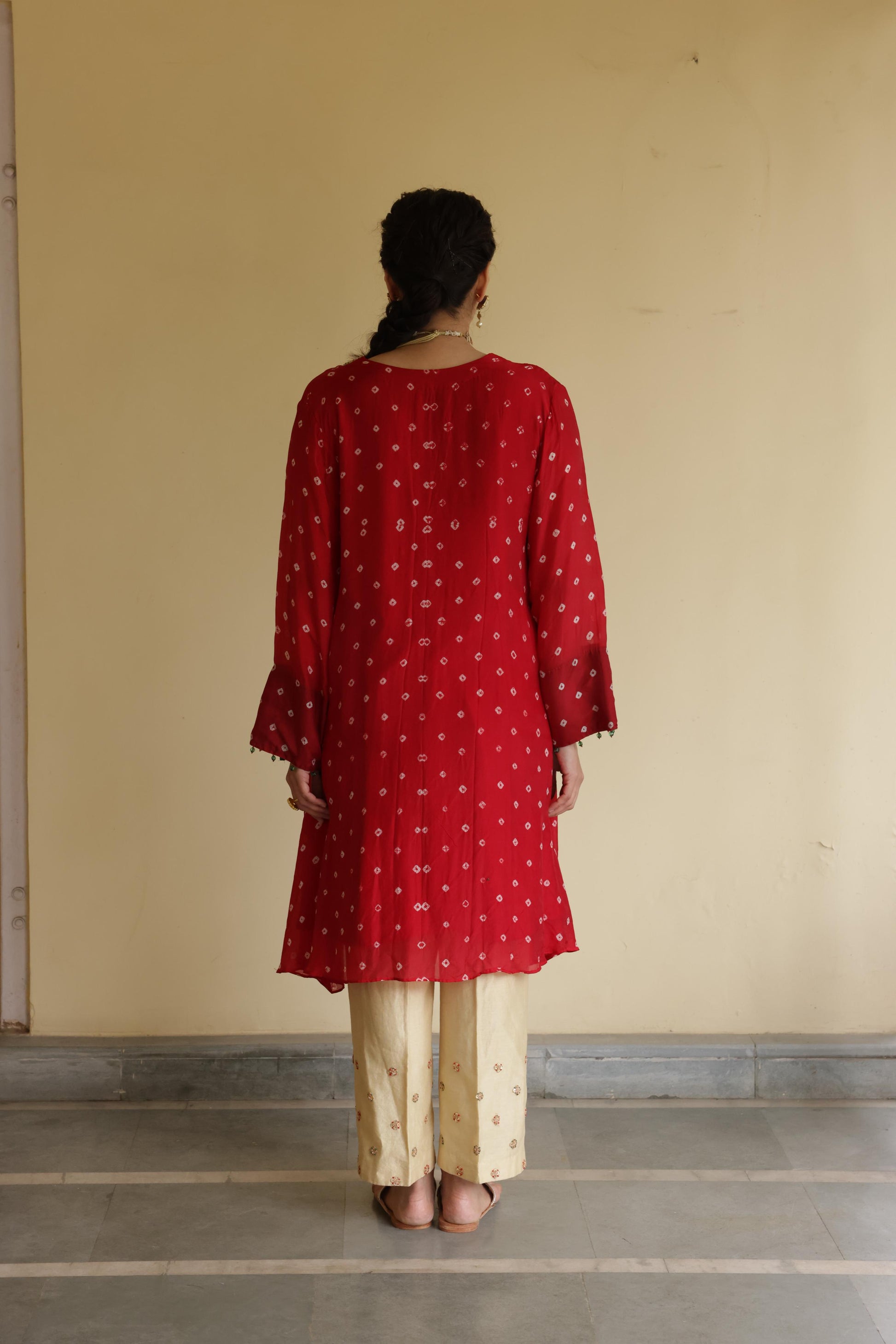 Description - Silk A-line Short Bandhej Kurta set handembroidered with marori border on neckline and embellishment on sleeves come with a chanderi pants with booties and paired with organza silk dupatta with all over booties and kiran.
