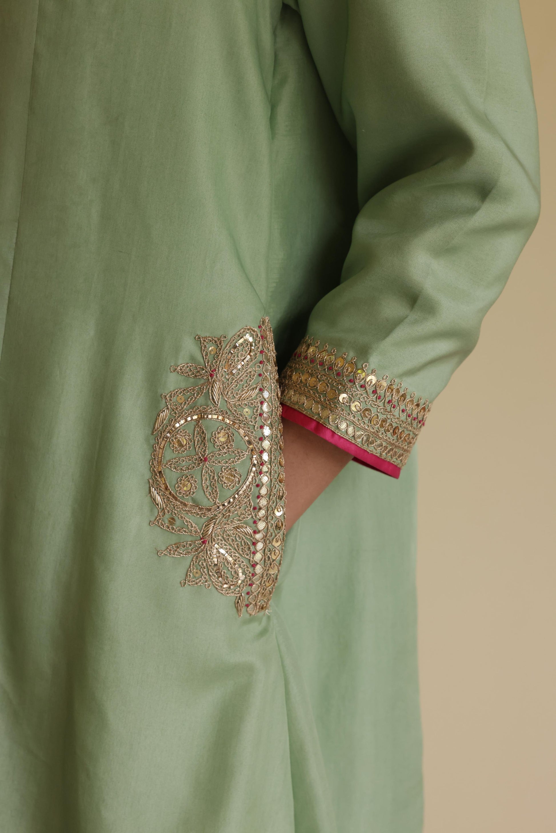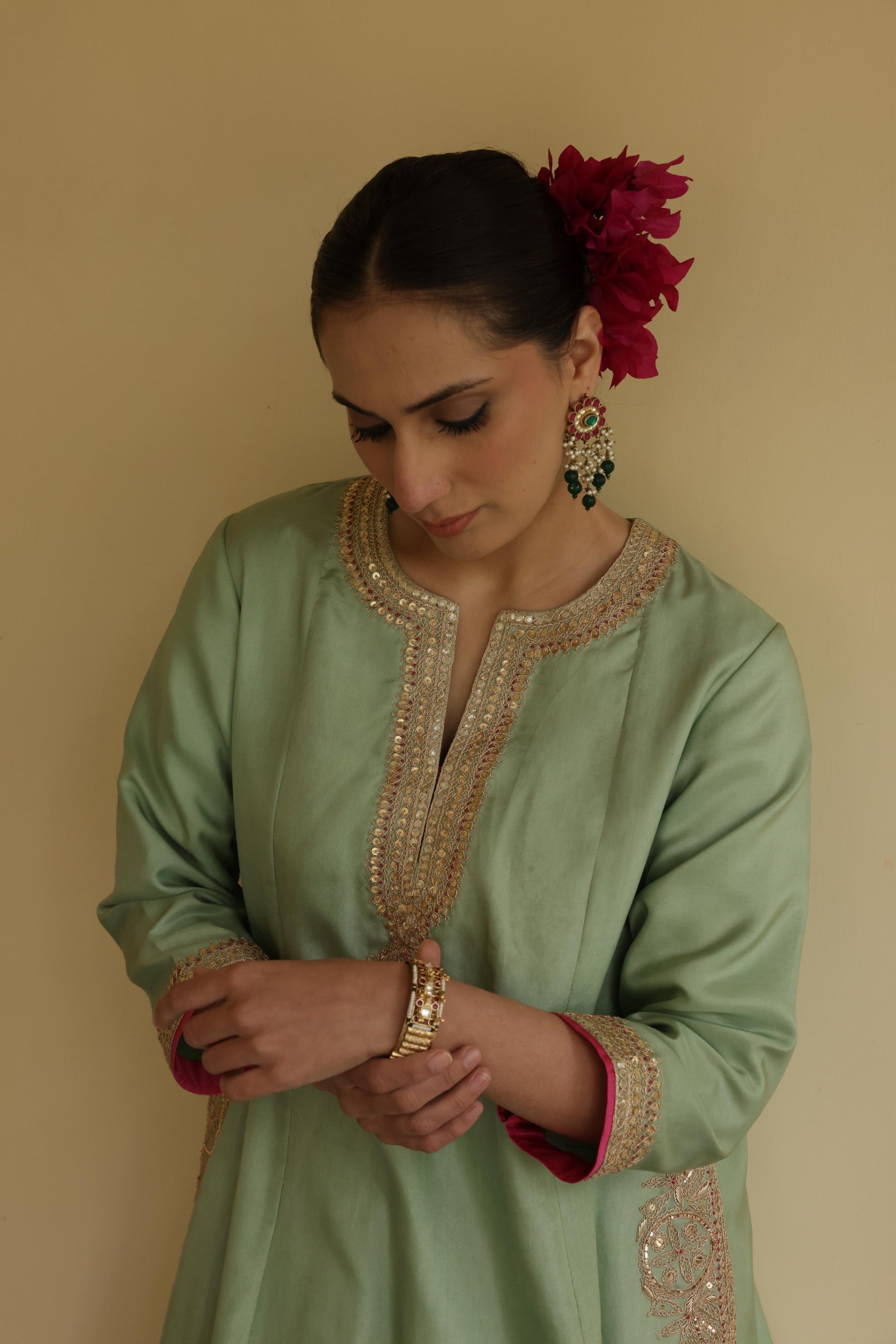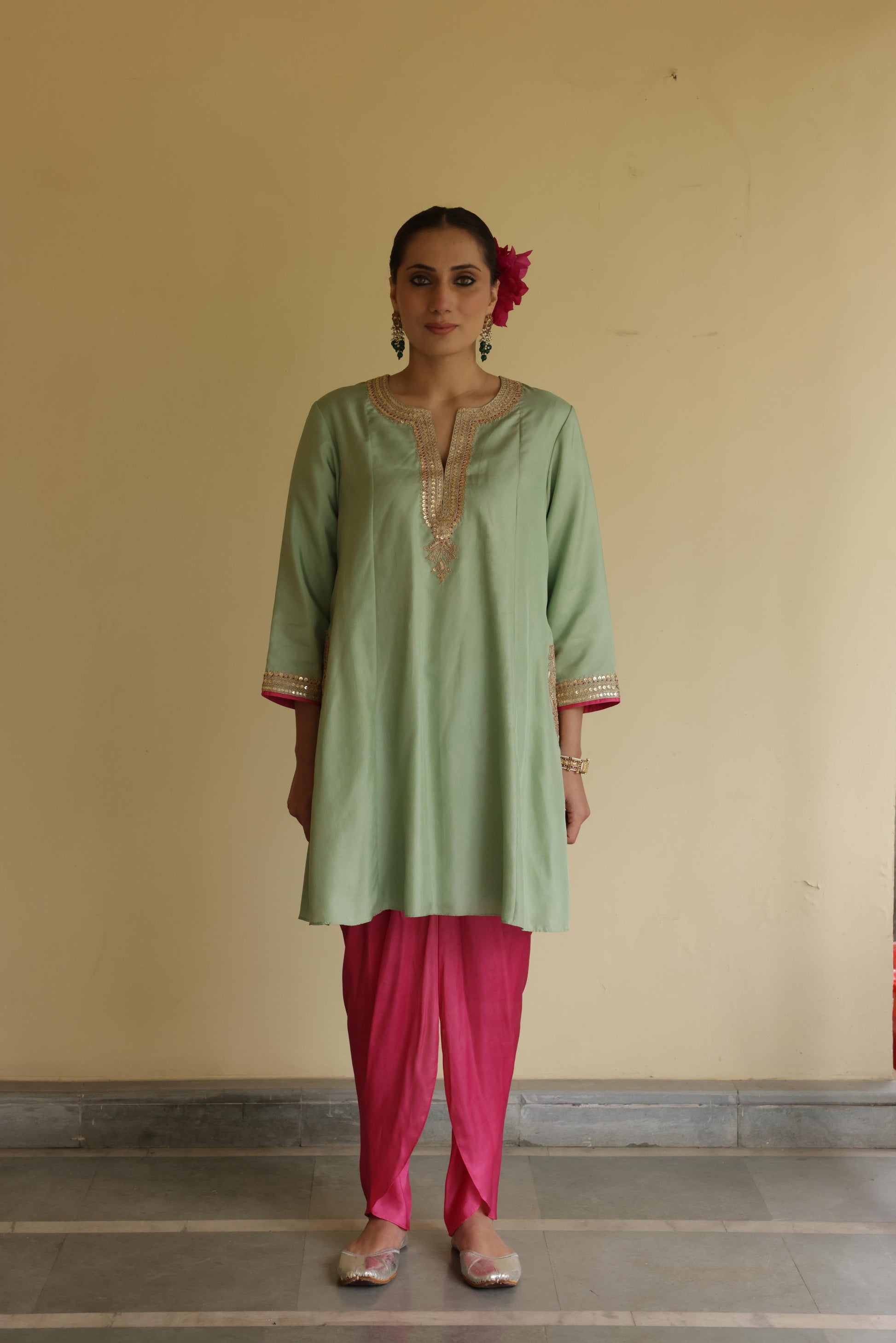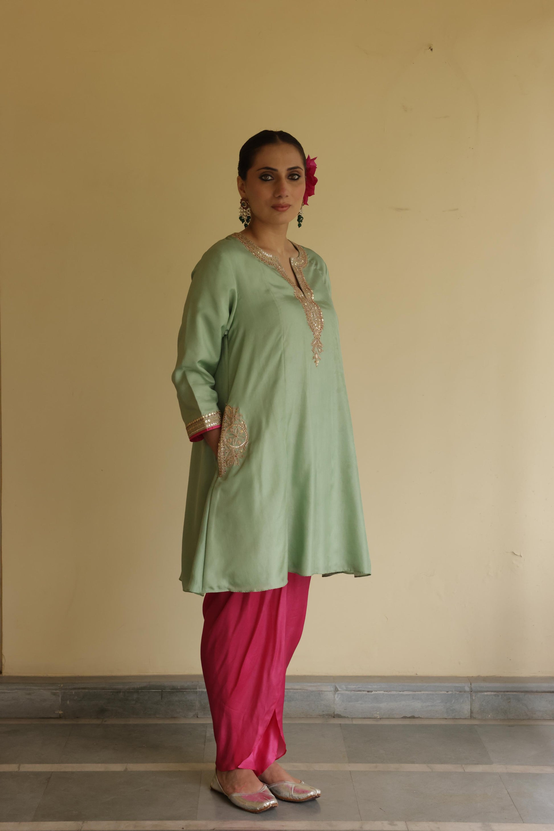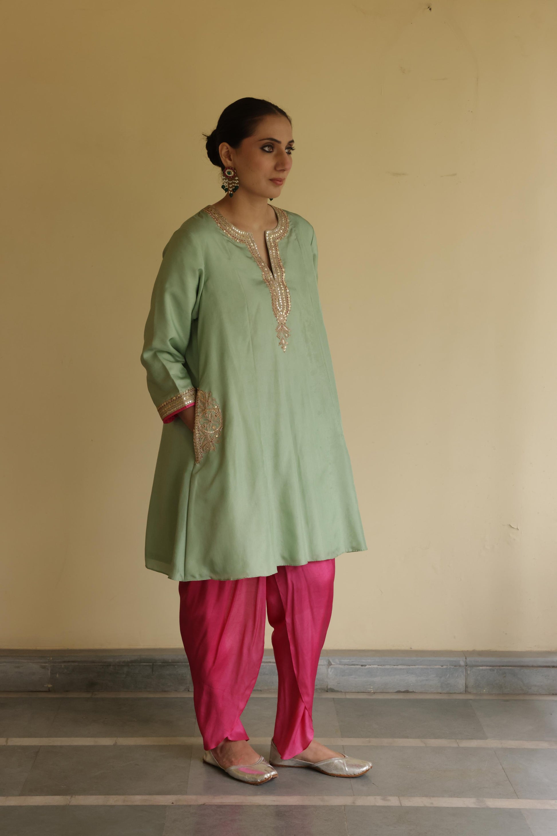 Description - Silk A-Line short kurta handembroidered with marori work on neckline,pockets and sleeves paired with bamber satin dhoti.