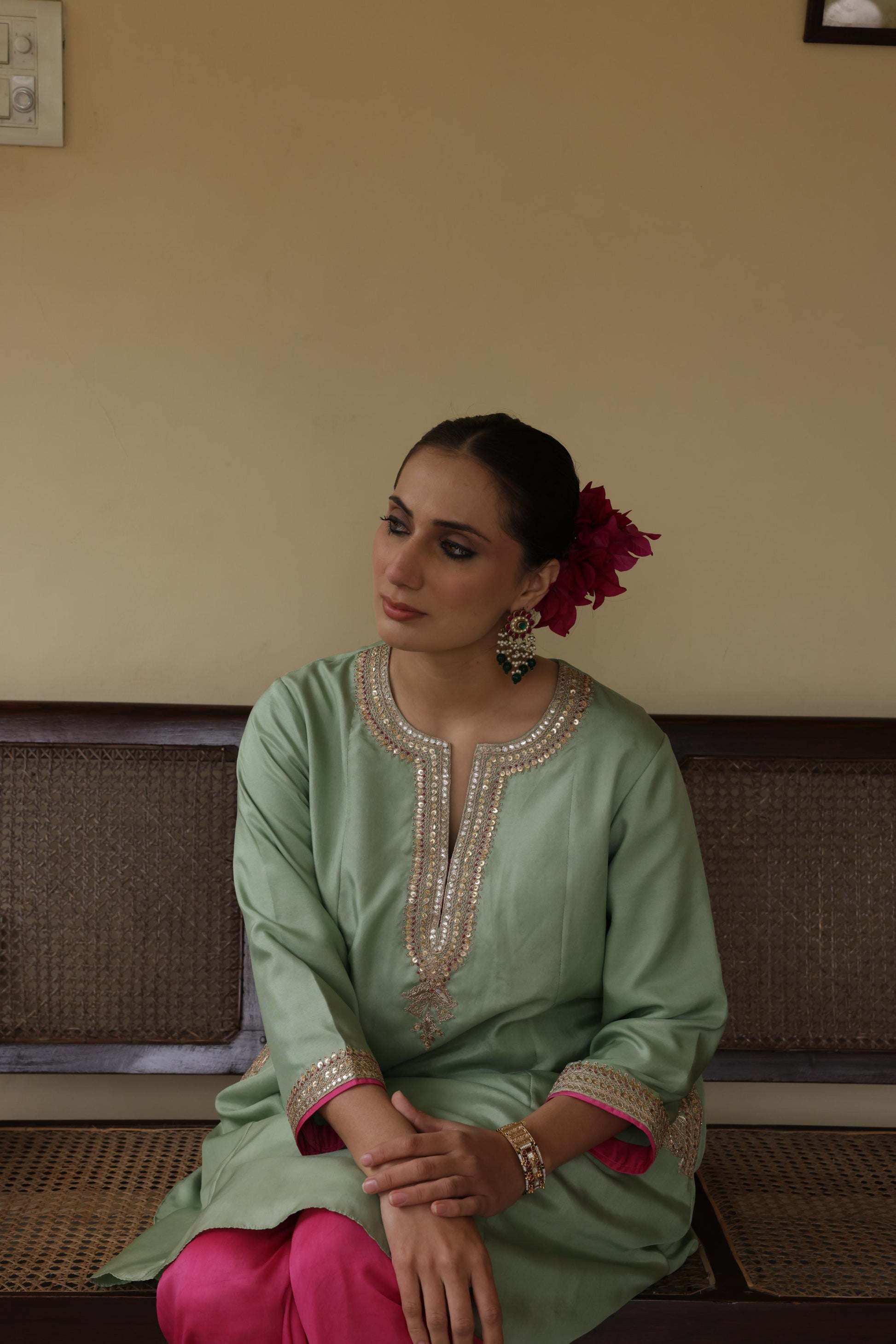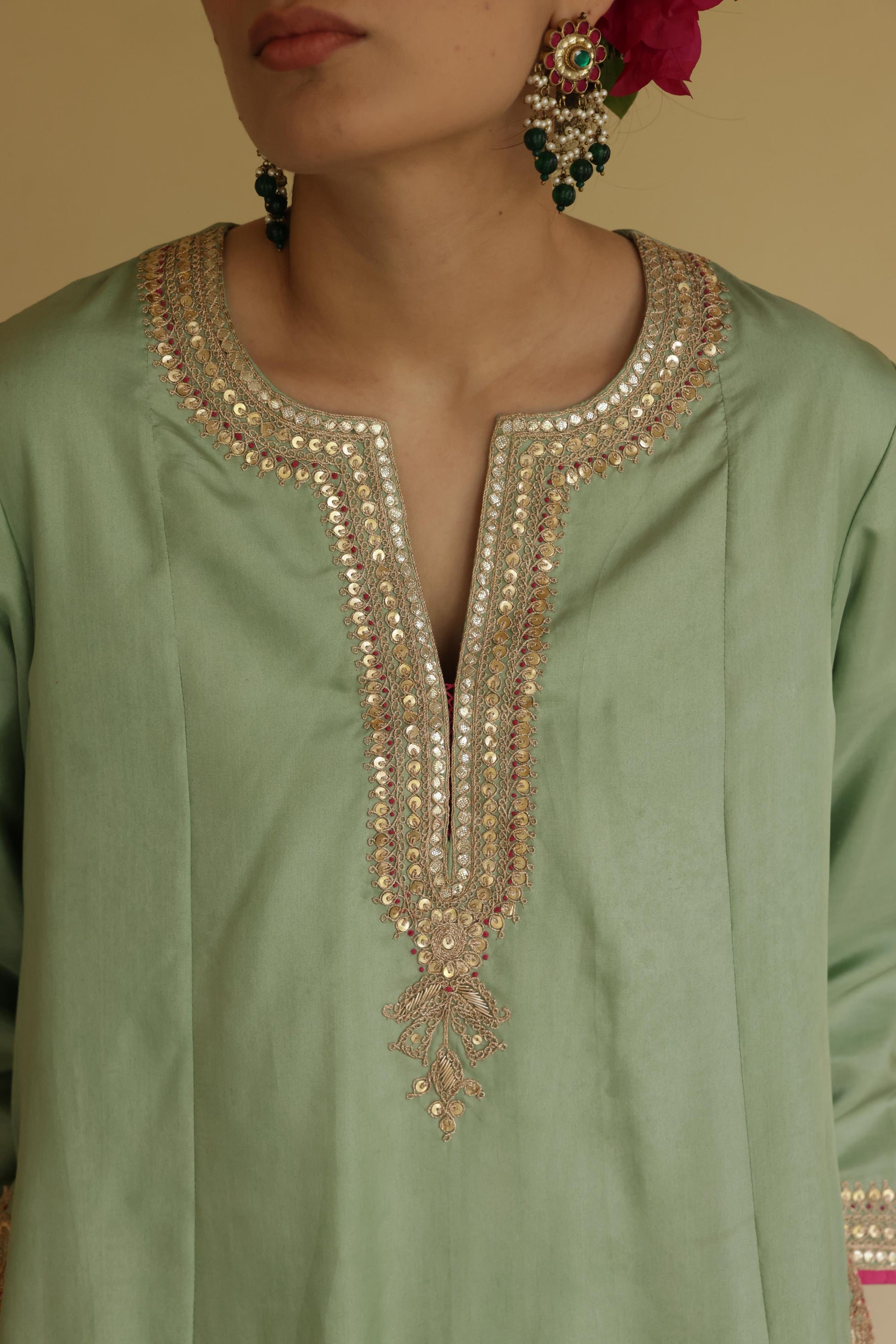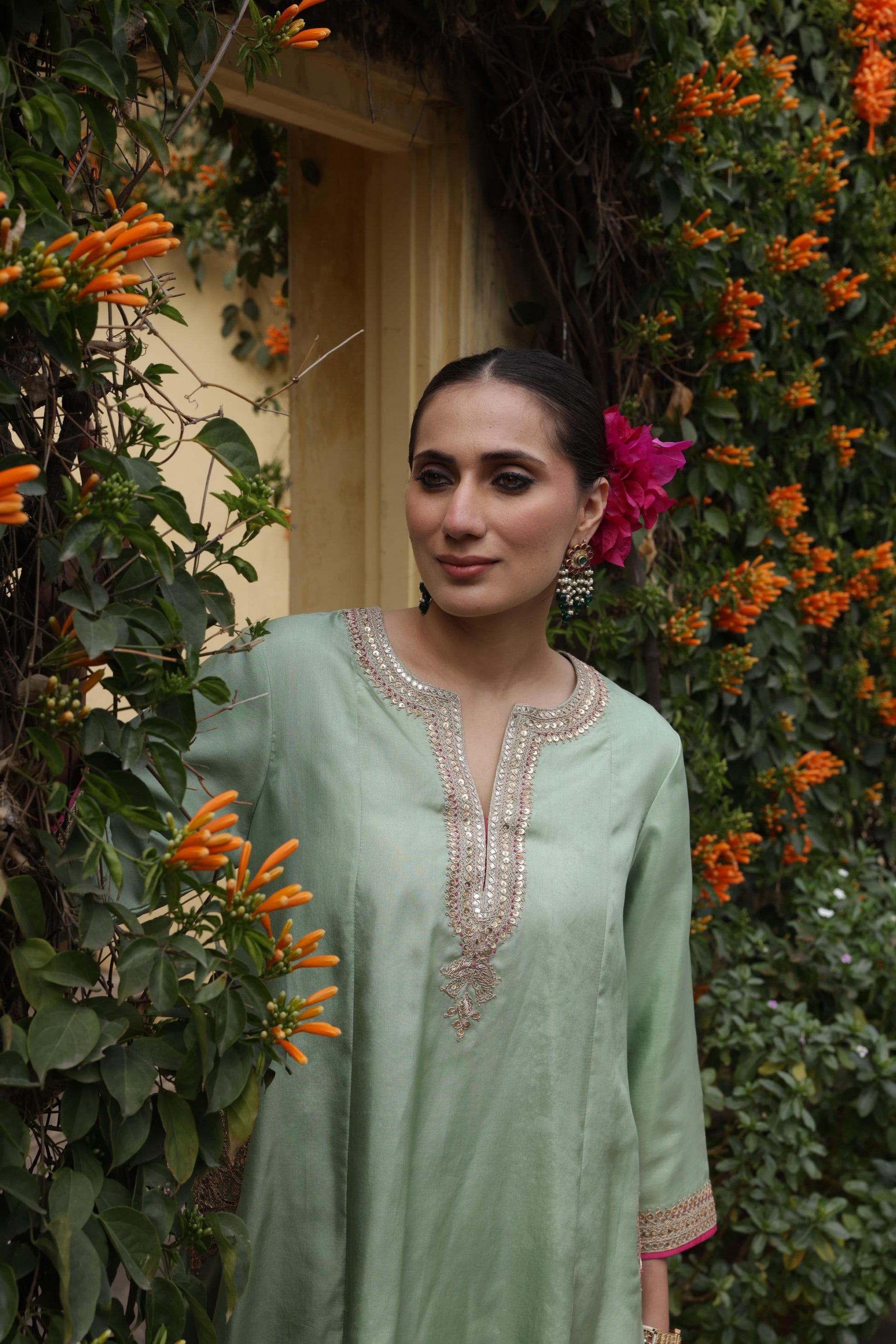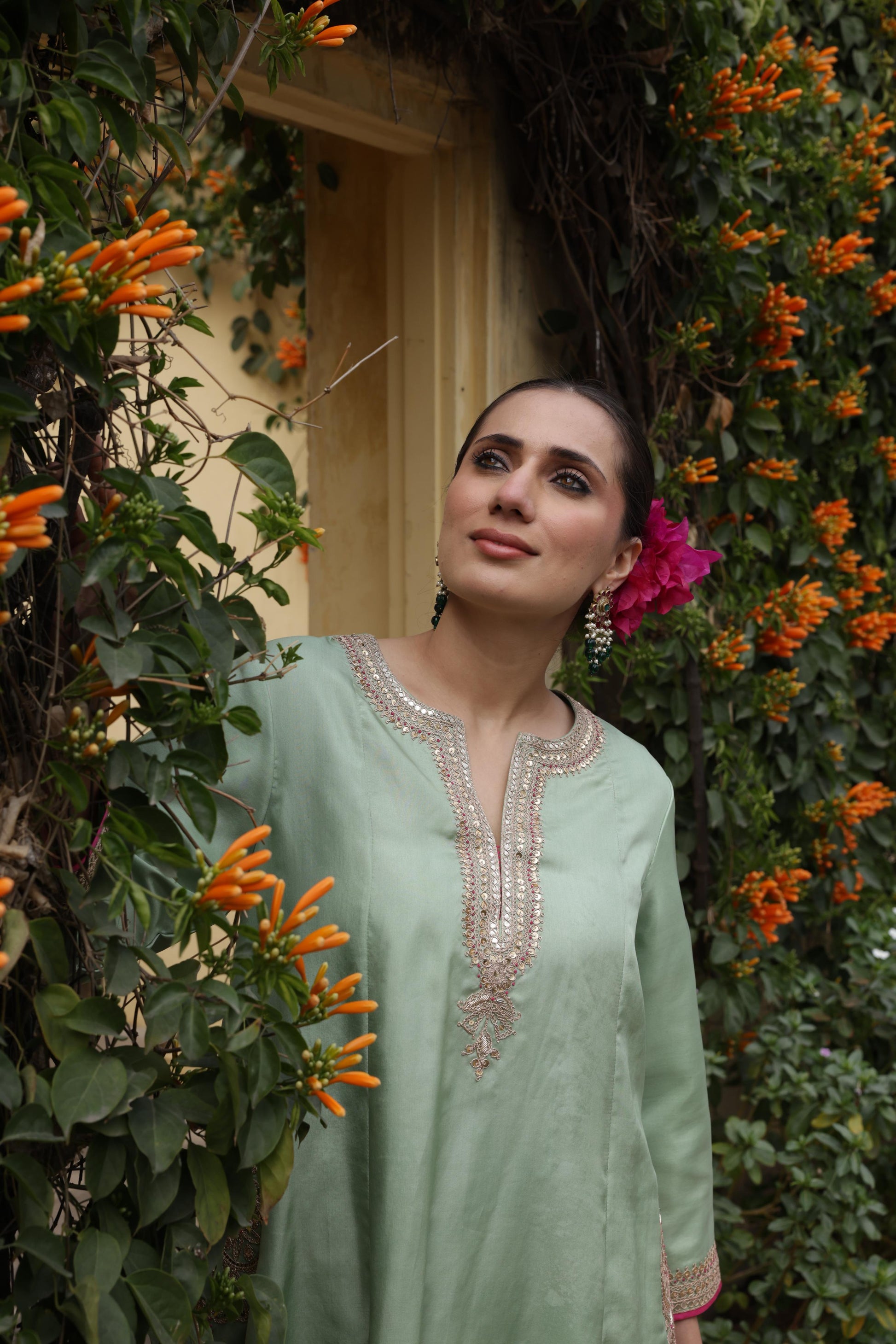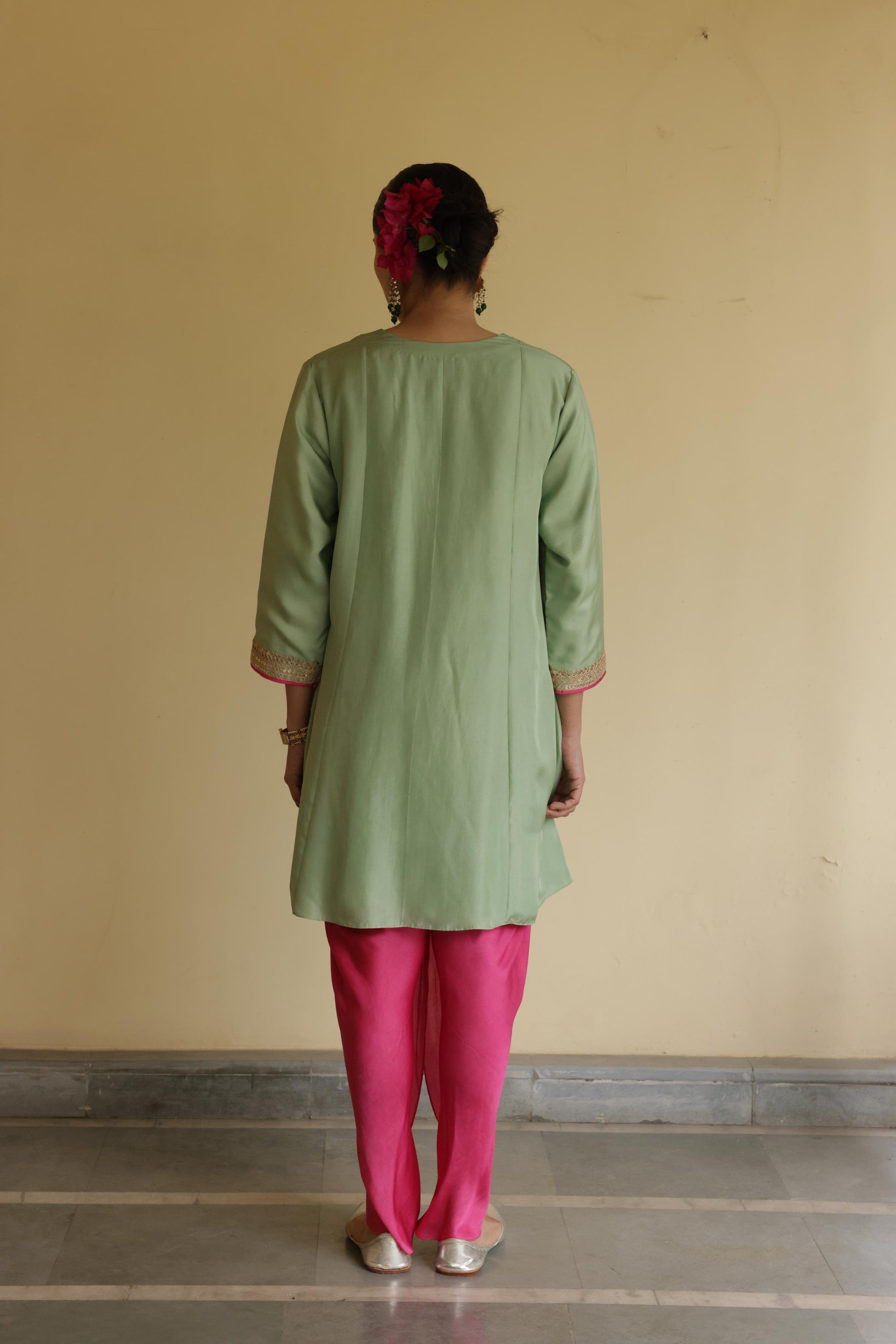 Description - Silk A-Line short kurta handembroidered with marori work on neckline,pockets and sleeves paired with bamber satin dhoti.