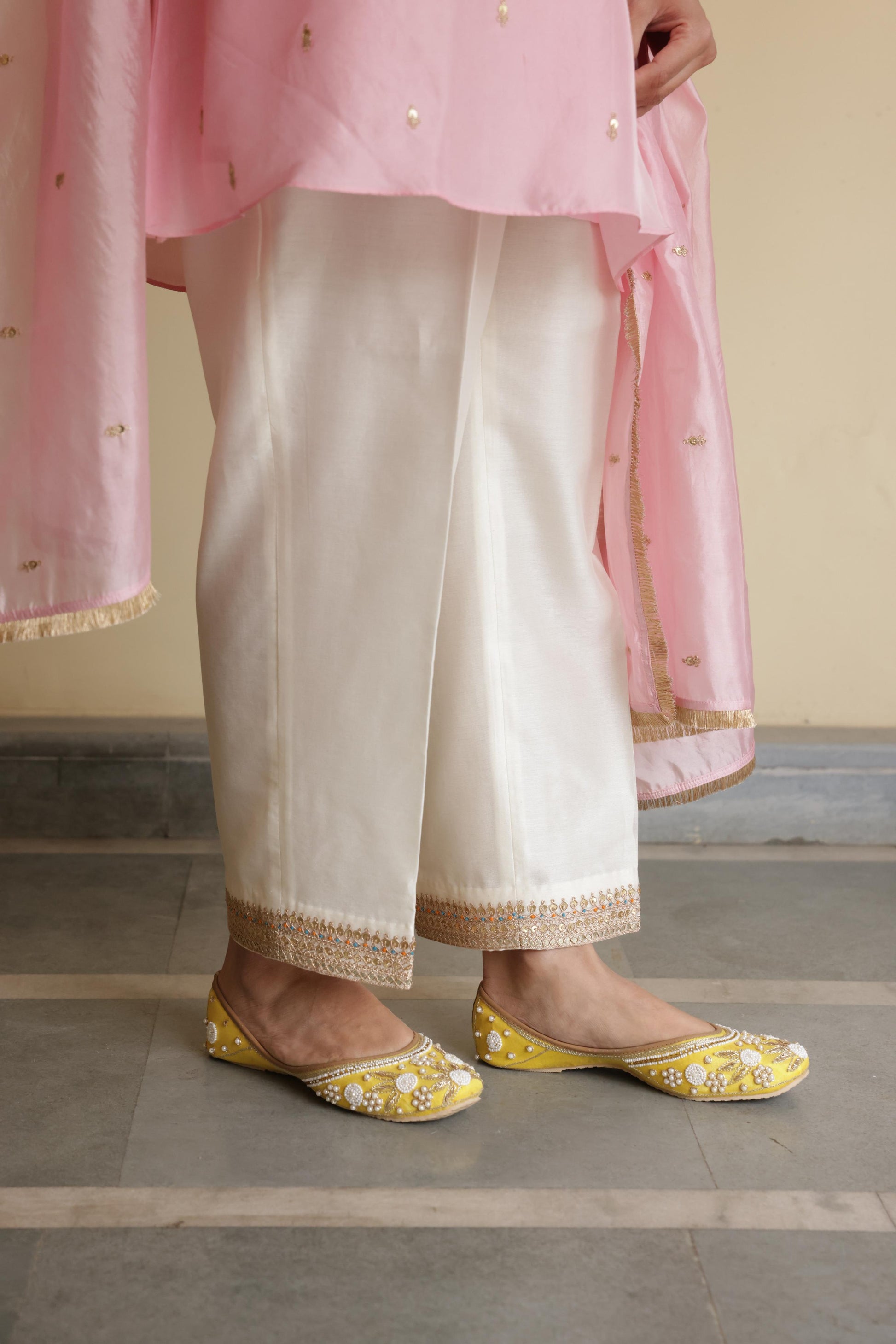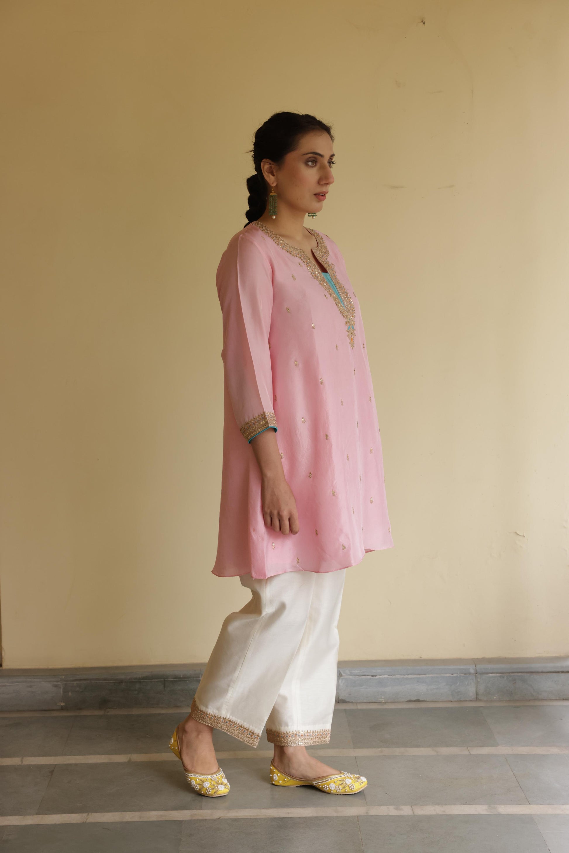 Description - Silk A-Line short kurta set hand embroidered with marori work comes with chanderi pants paired with silk organza dupatta all over booties on it and finished with kiran.