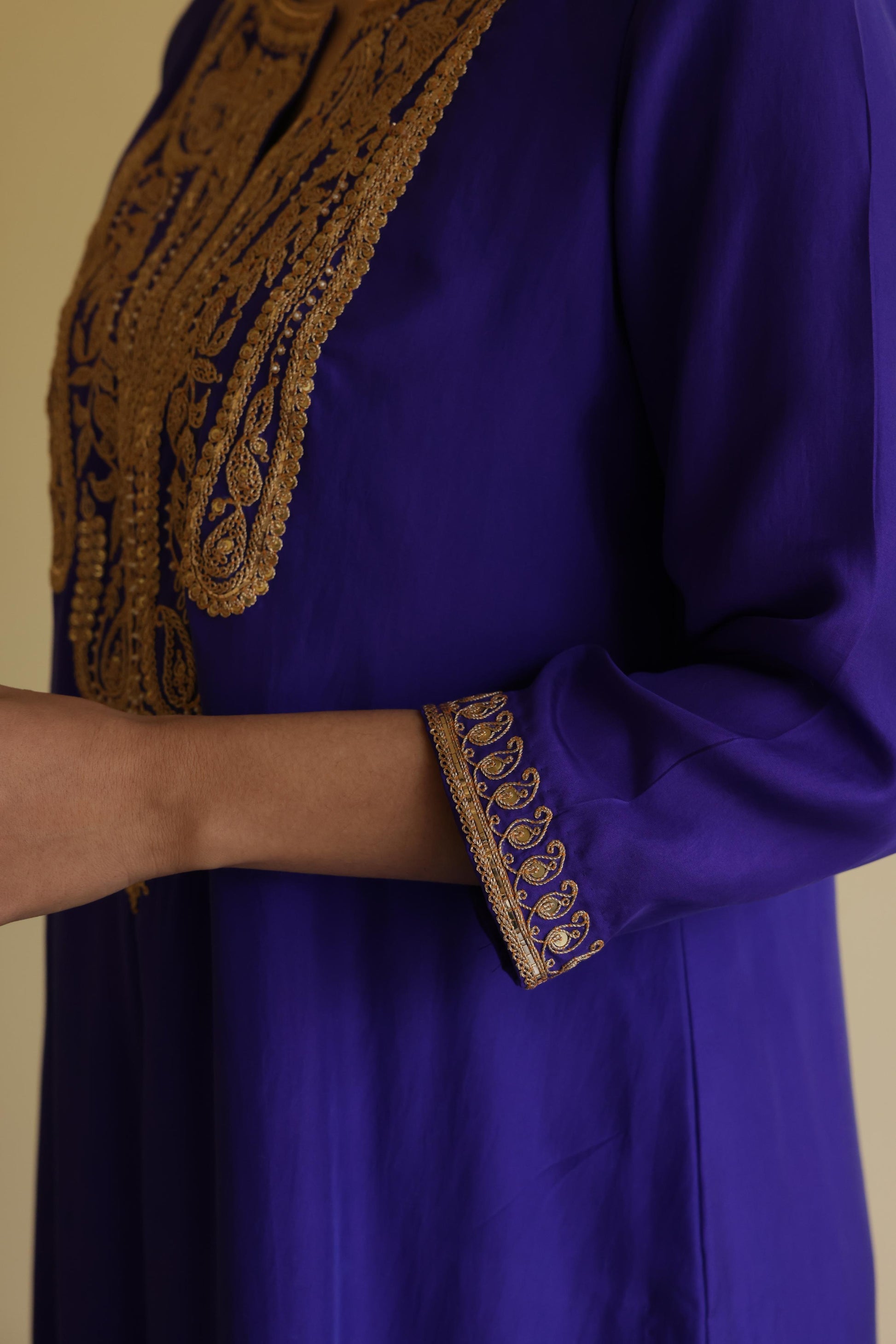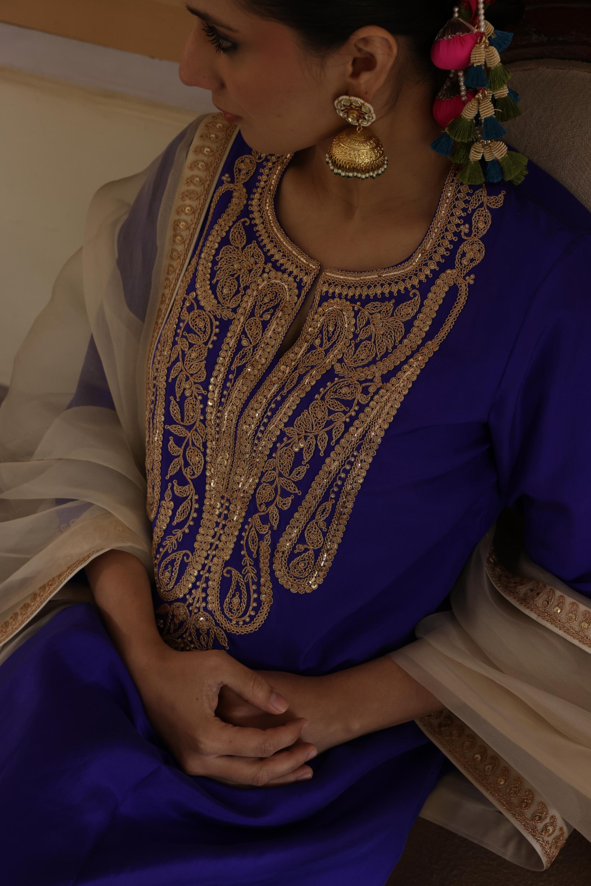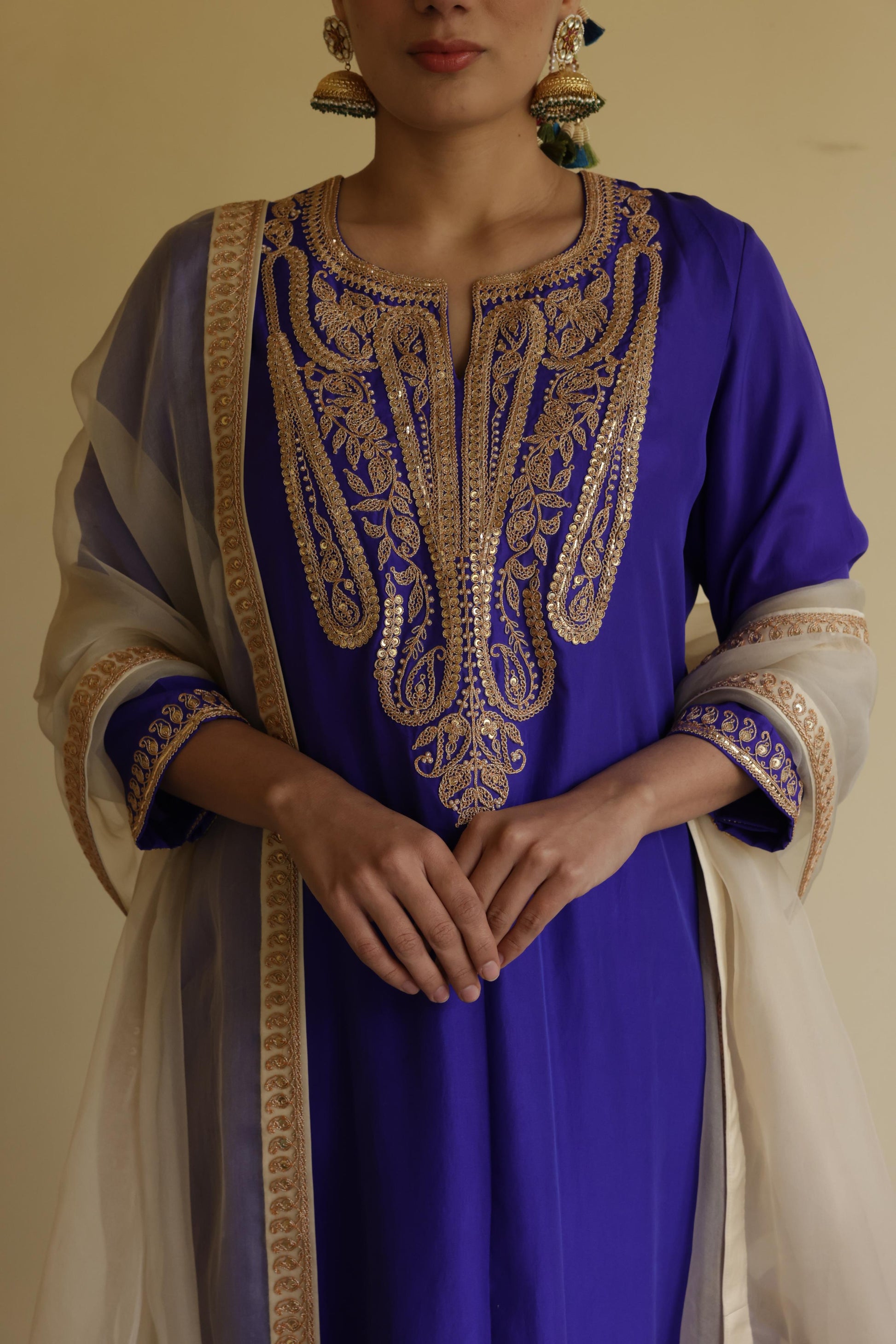 Description - Silk kurta set detailed and handembroidered with marori work comes with a silk pants and organza dupatta with marori border.