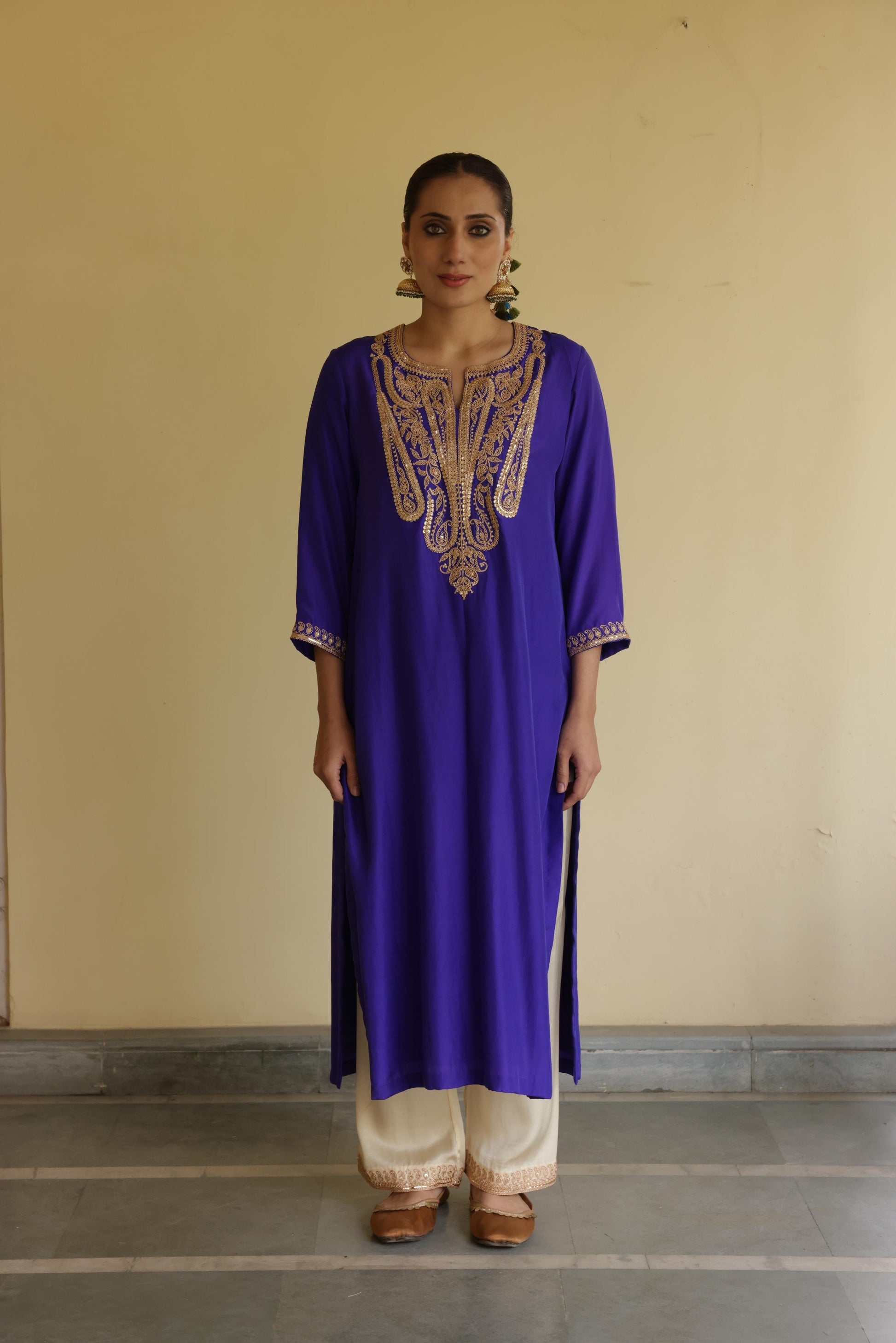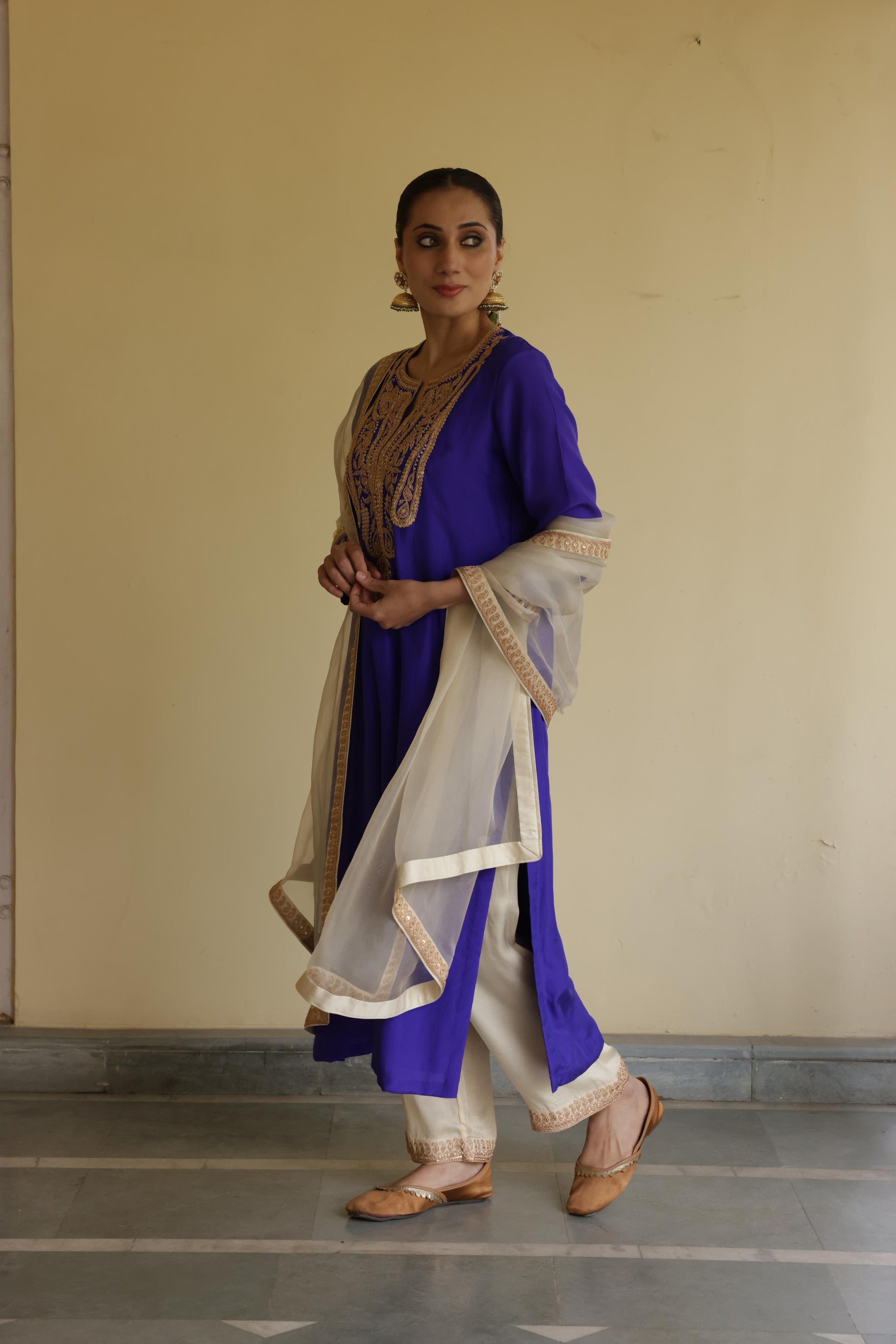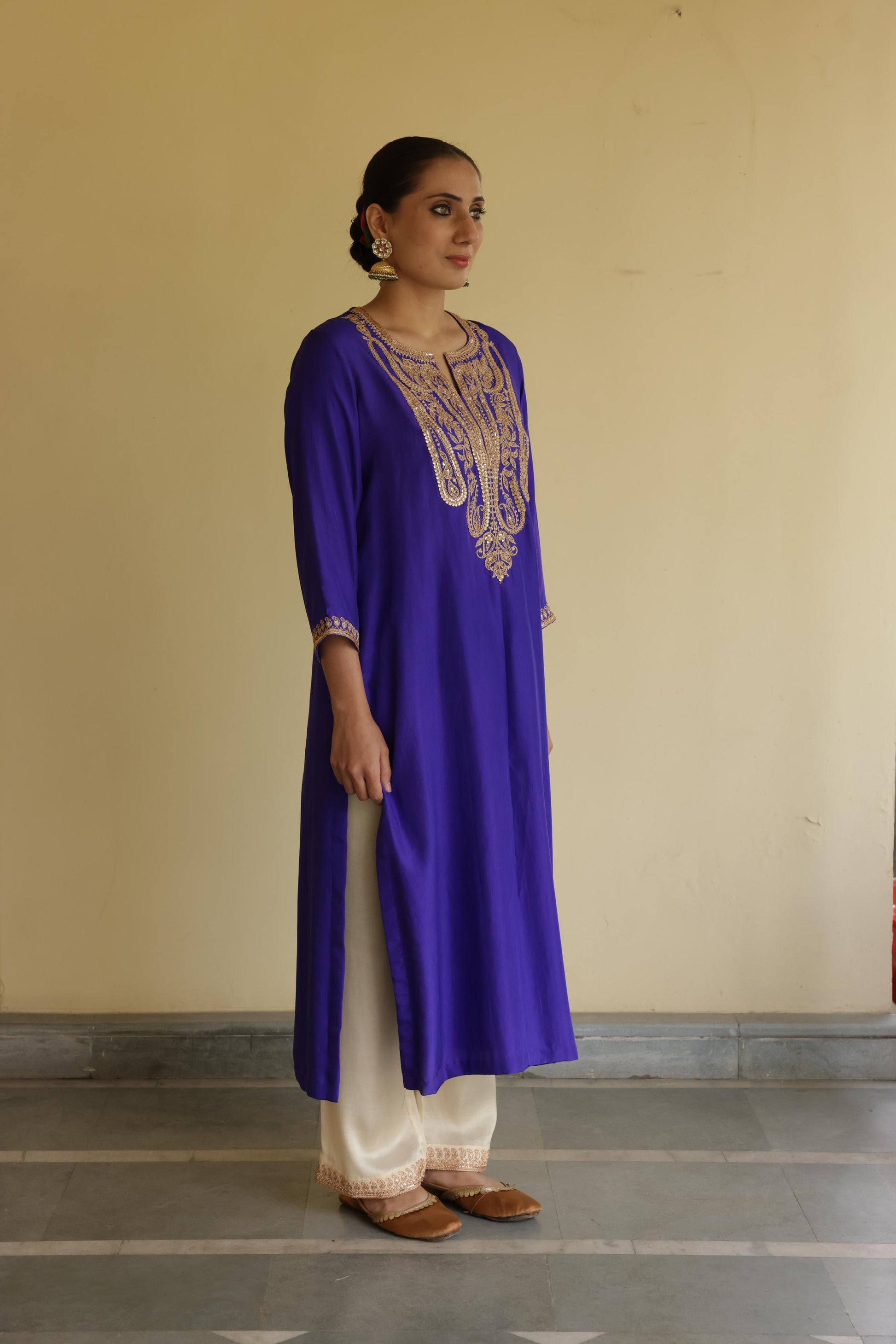 Description - Silk kurta set detailed and handembroidered with marori work comes with a silk pants and organza dupatta with marori border.