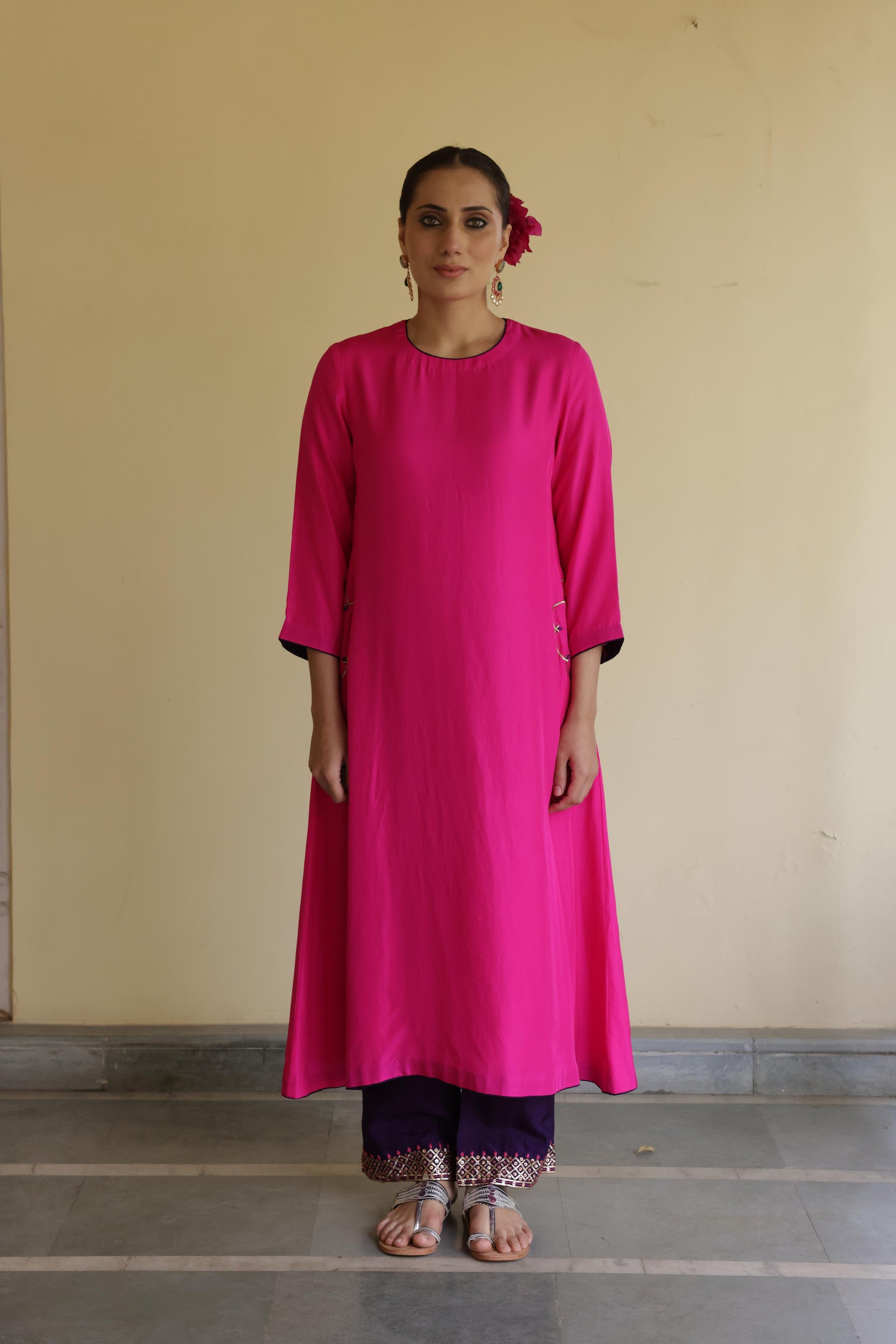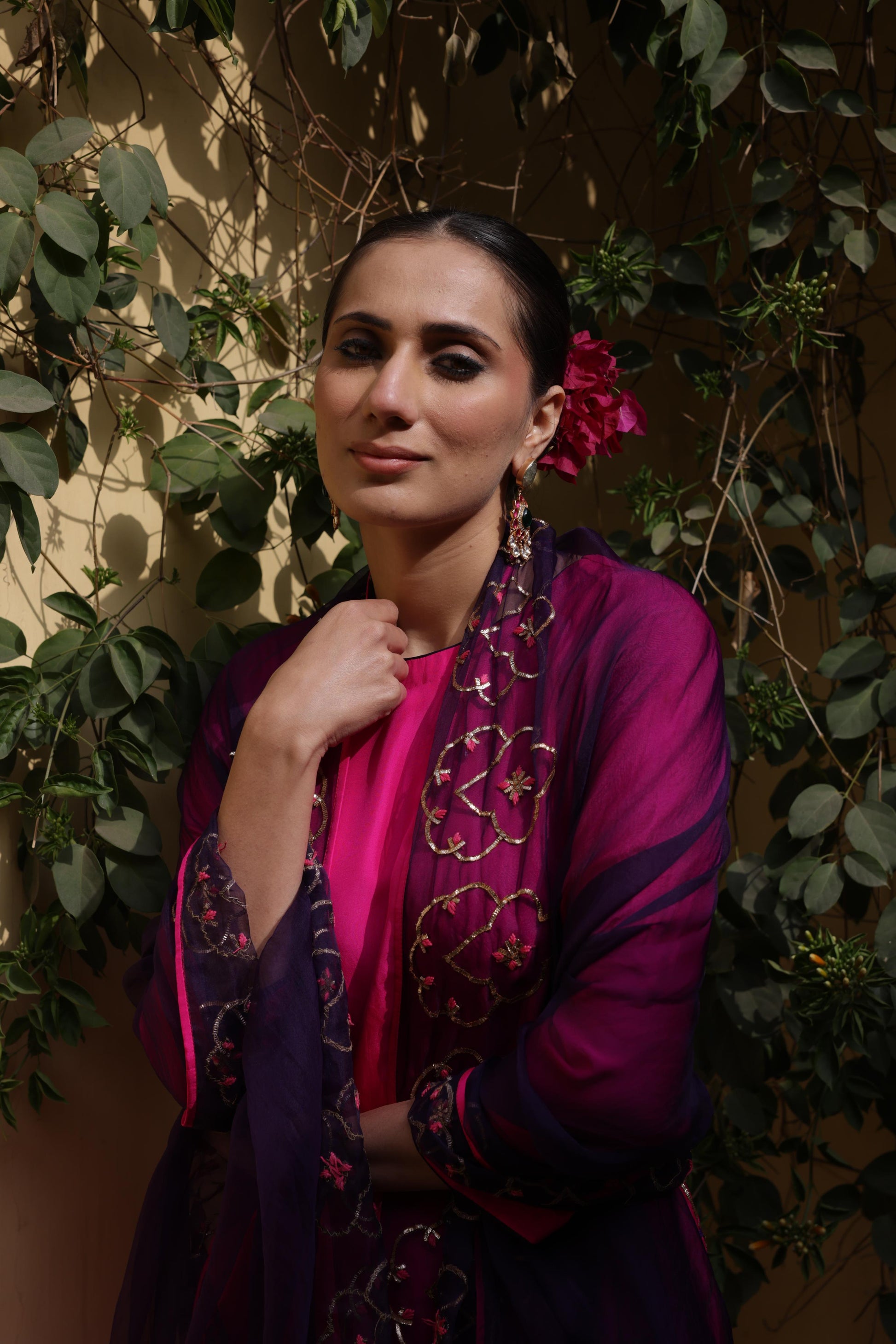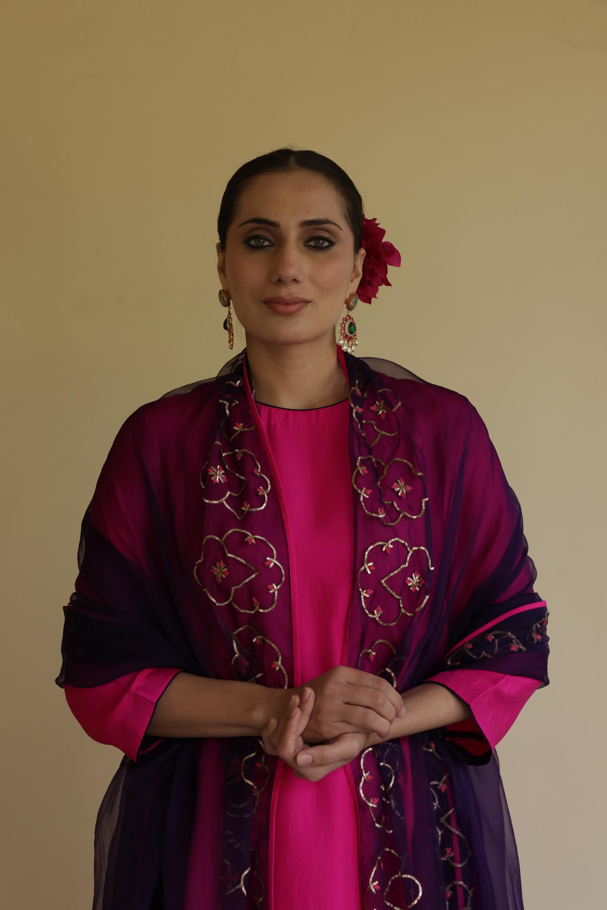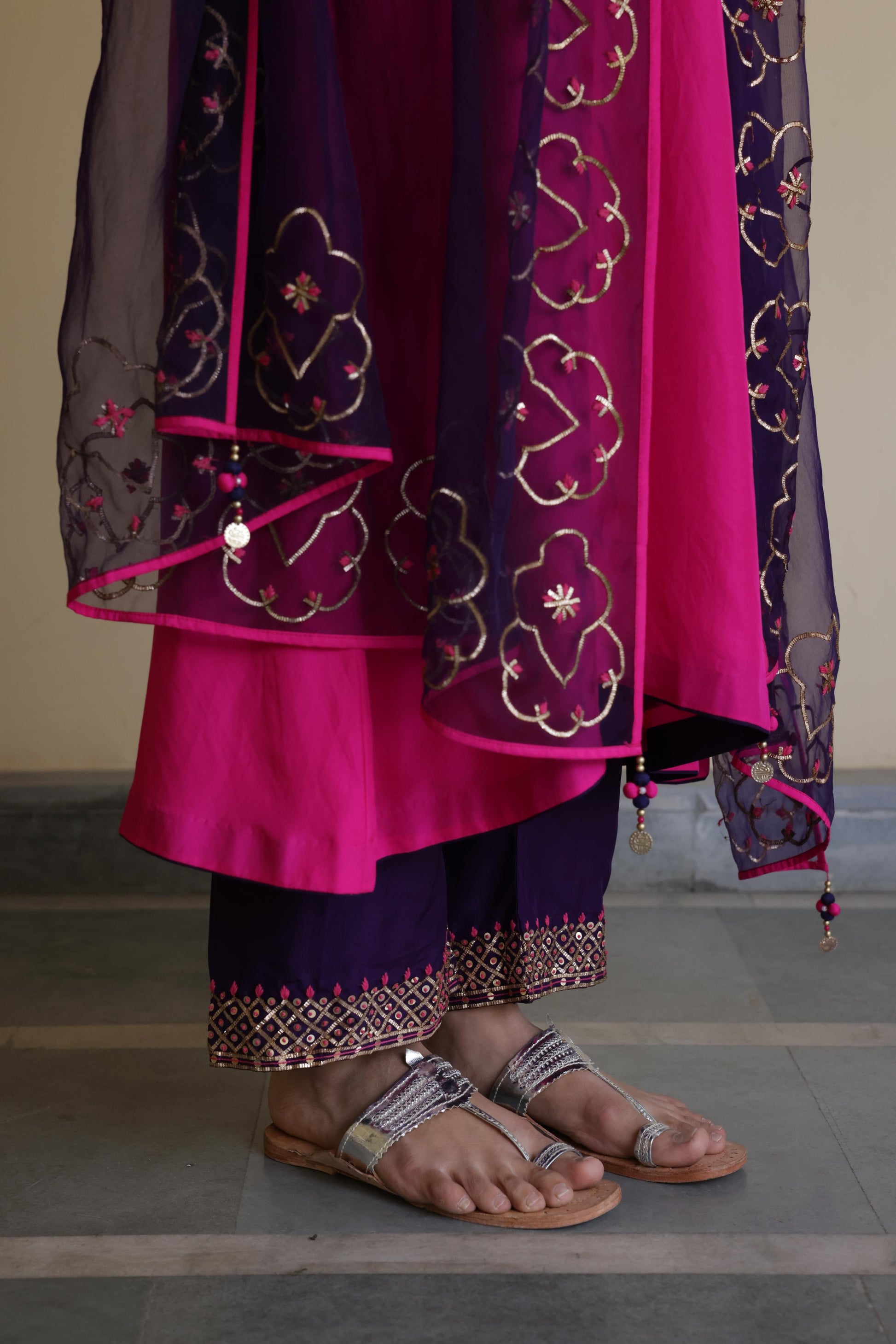 Description - Silk A-Line kurta set handcrafted with kaccha gota comes with silk pants and paired with organza dupatta with jaal border.