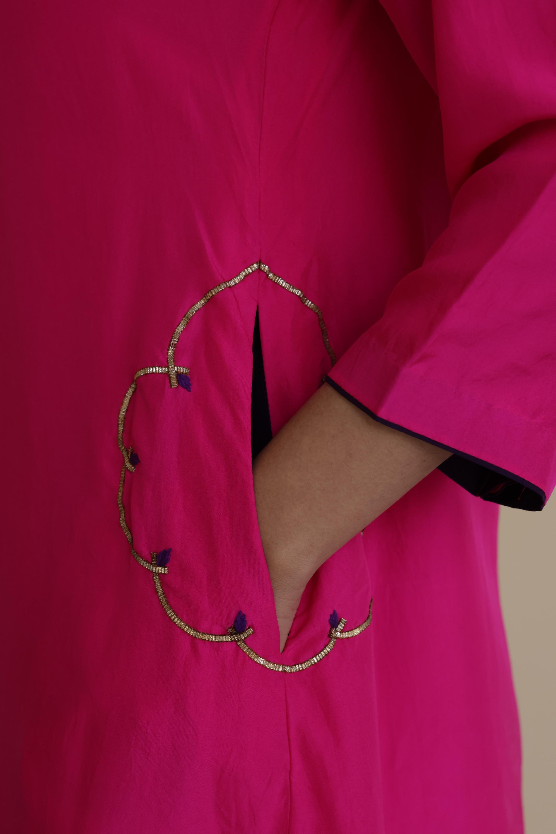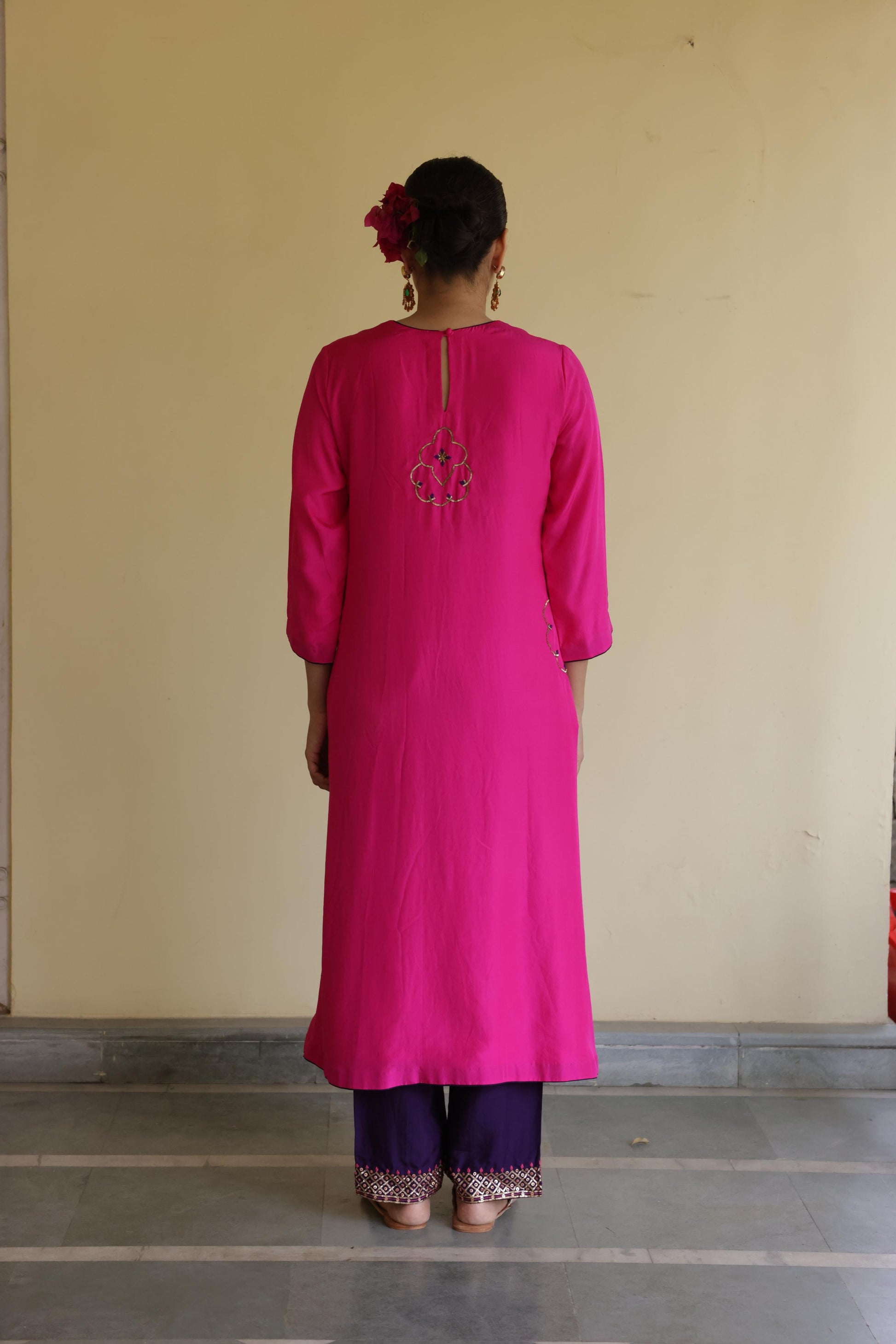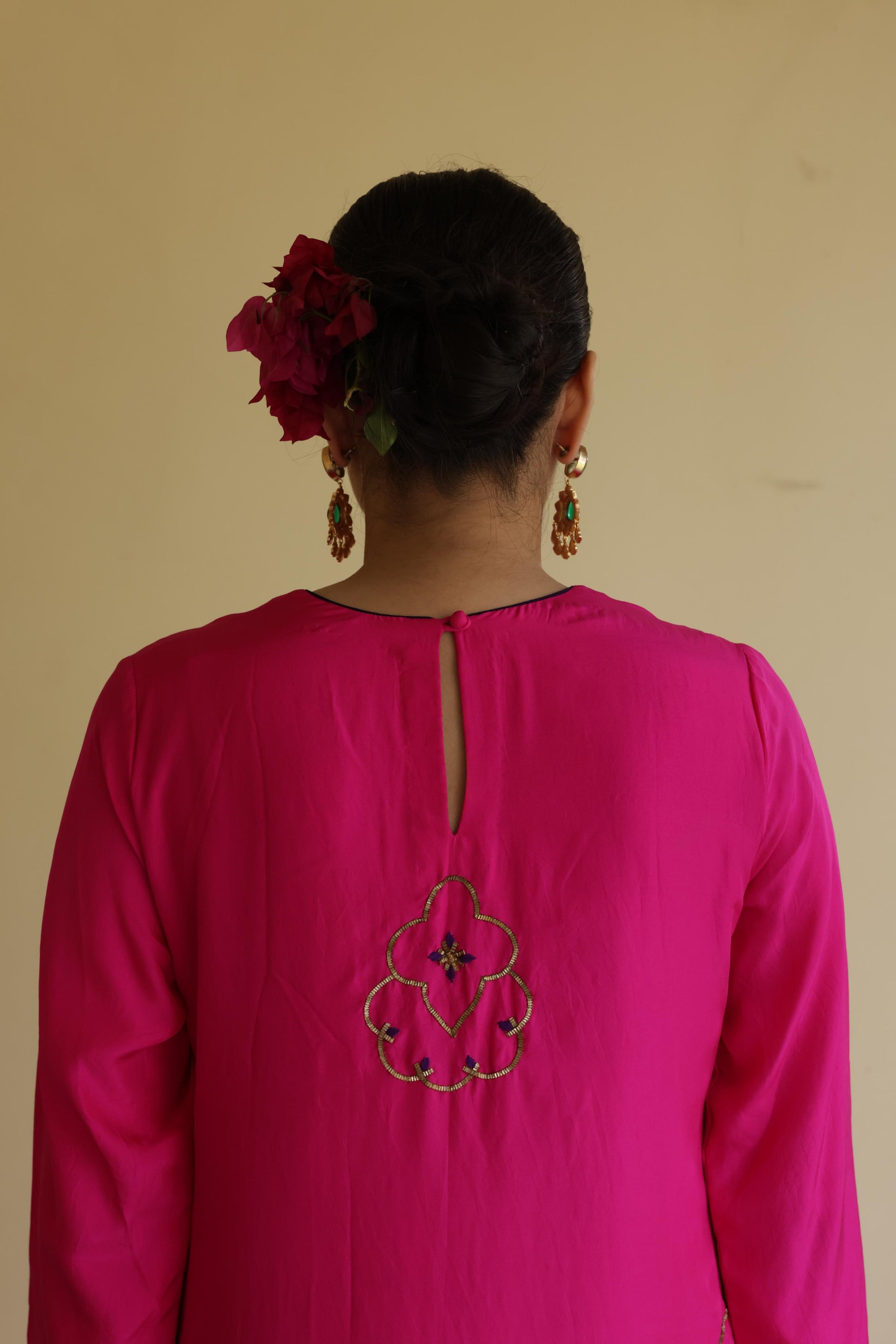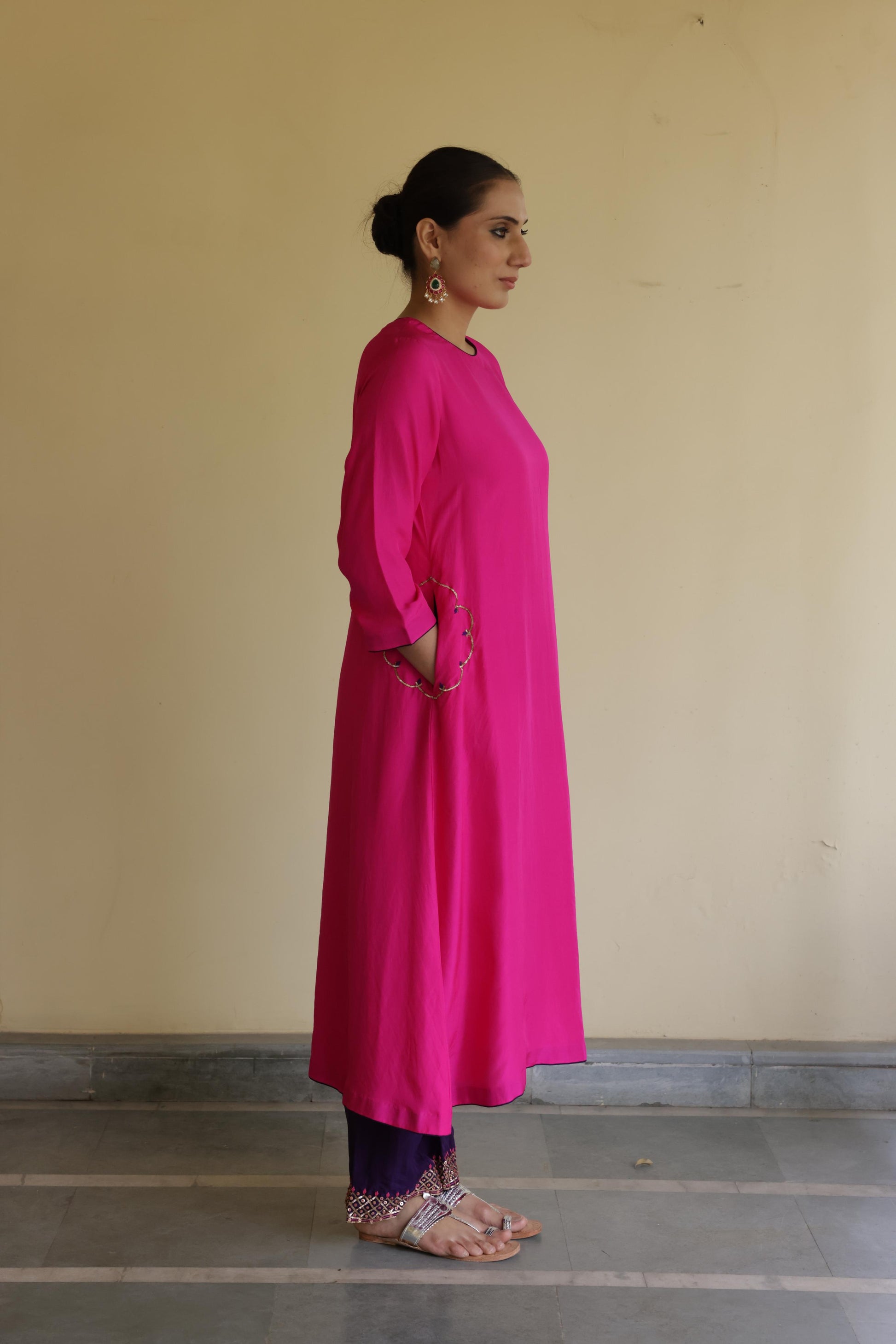 Description - Silk A-Line kurta set handcrafted with kaccha gota comes with silk pants and paired with organza dupatta with jaal border.