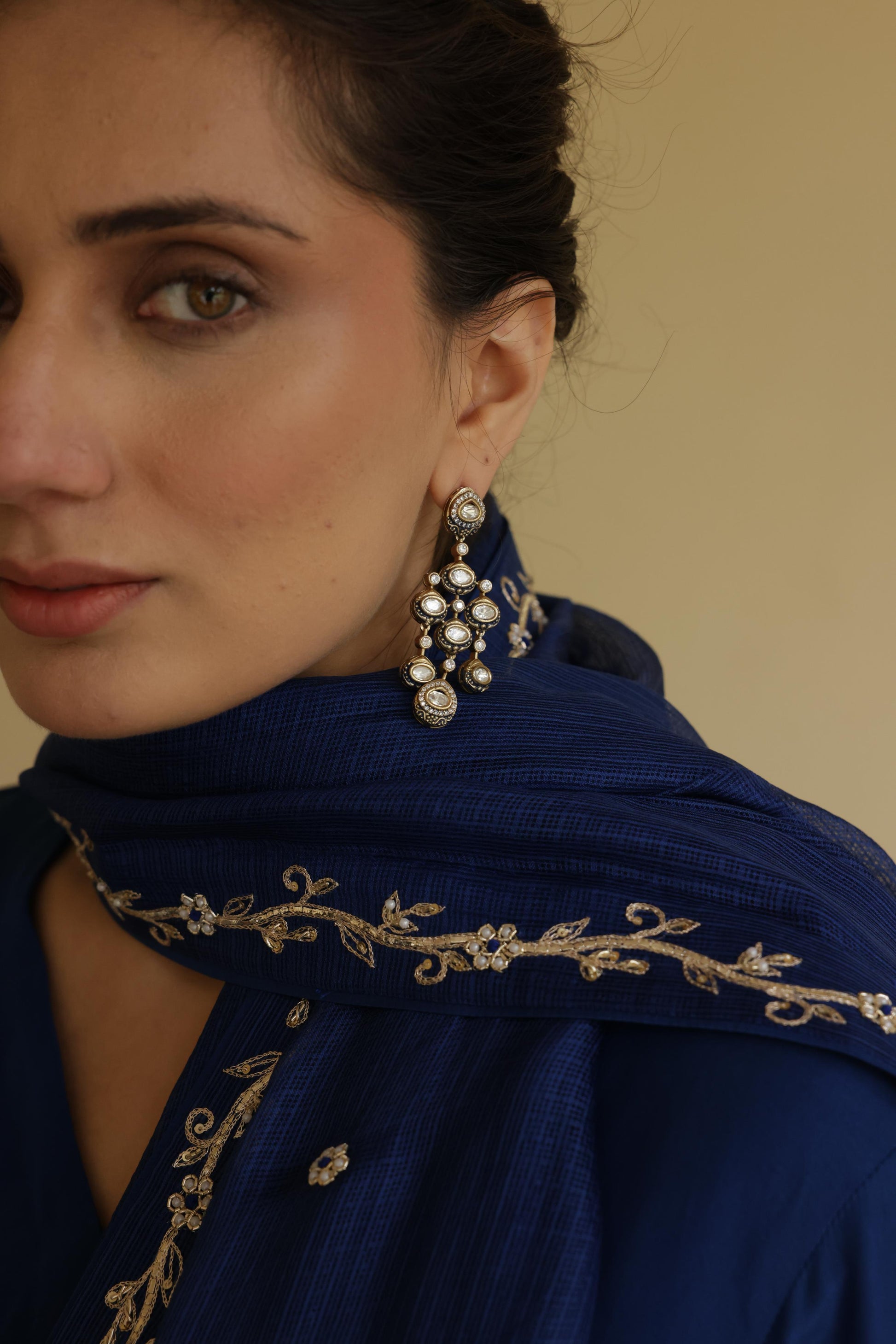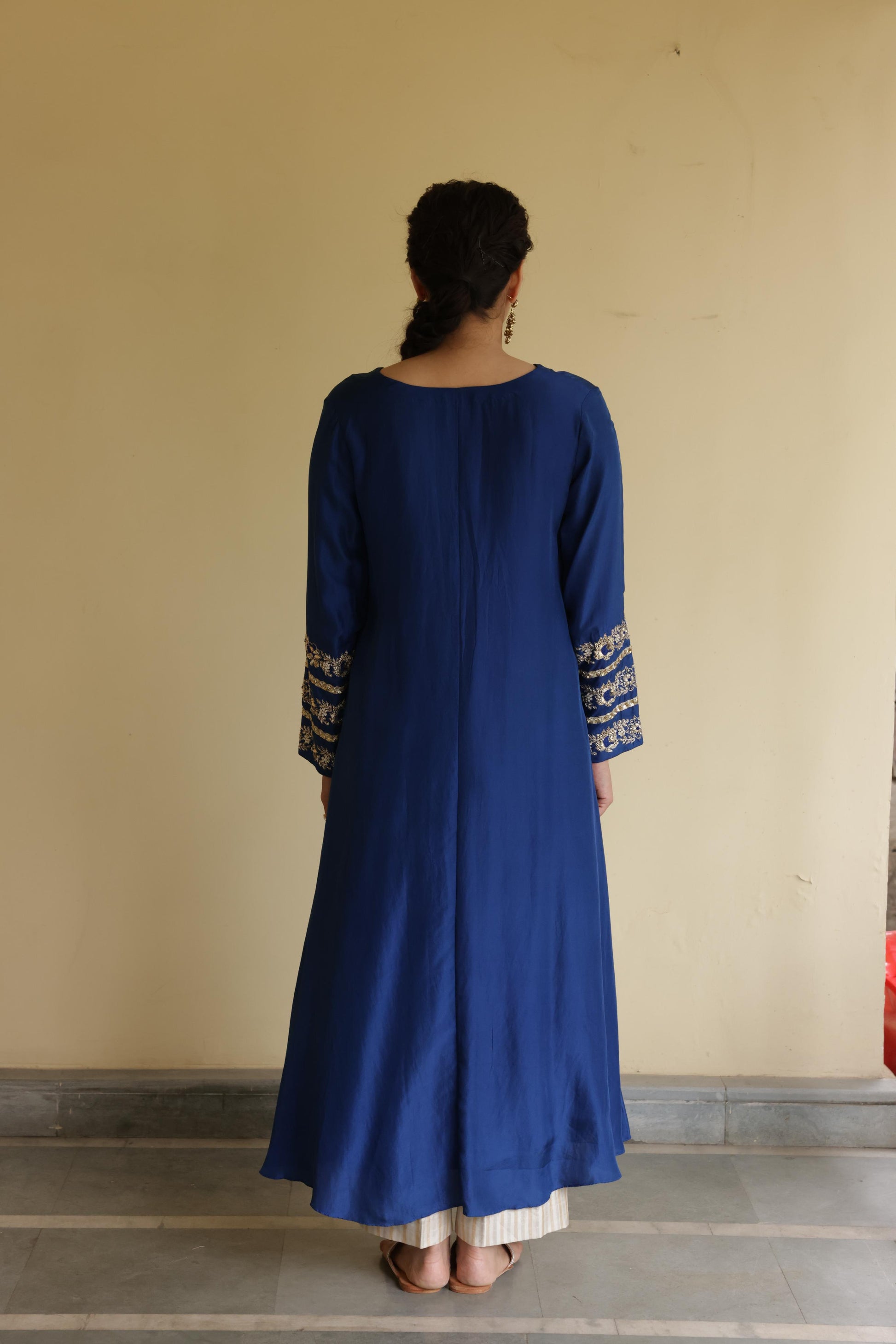 Description - Silk A-Line kurta set hancrafted with zardozi work on sleeves border , comes with a self striped tissue pants with kota silk dupatta detailed with zardozi border.