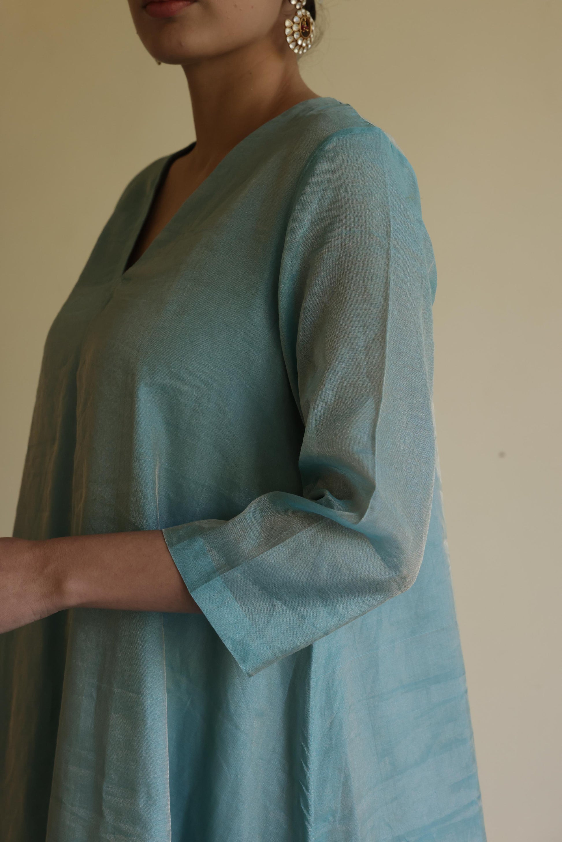 Description - Tissue A-Line kurta set comes with self stripe tissue pants paired with organza silk dupatta .